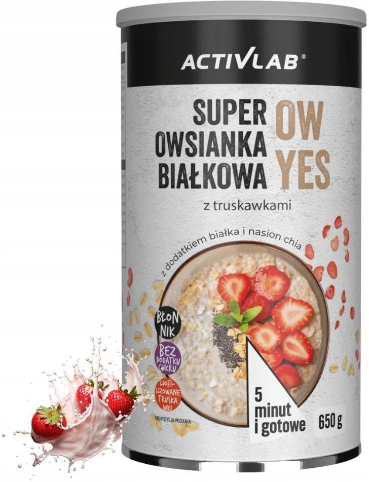 ACTIVLAB Super Owsianka Białkowa OW YES 650 g smak: truskawkowy Cechy produktu Duża ilość białka i błonnika – aż 10,9 g białka i 15 g błonnika w 100 g porcji Źródło naturalnych witamin i minerałów – zawiera m.in. magnez, fosfor, żelazo, cynk, mangan oraz witaminę B1 Z dodatkiem owoców …