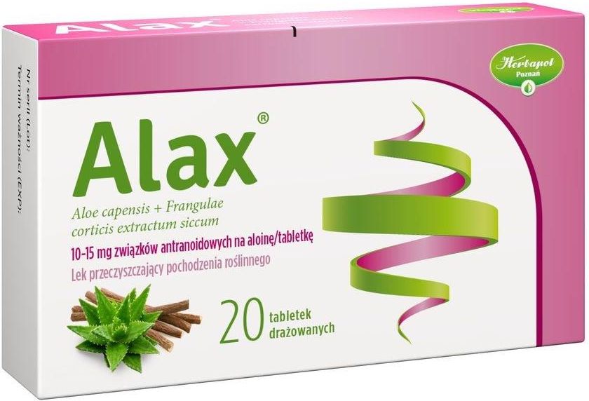 RODZAJ REJESTRACJI: Lek PRODUCENT: HERBAPOL S.A. ADRES PRODUCENTA: UL. TOWAROWA 47/51, 61-896 POZNAŃ ILOŚĆ: 20 drażetek OPIS: Alax lek roślinny ułatwiający wypróżnianie zalecany do stosowania w zaparciach. Właściwości substancji leczniczych zawartych w wyciągu z aloesu, nadają mu szeroki zakres wskazań do stosowania. Poczynając od uzupełnienia diety w minerały i witaminy, poprzez doraźne niwelowanie uciążliwych zaparć, aż do wzmacniania odporności i zwalczania infekcji. W zależności od wskazań, stosuje się jedną z dwóch form terapeutycznych – sok lub tabletki. Sok z aloesu stosuje się w celu wzmocnienia organizmu i uzupełnienia niedoborów witaminowych. Natomiast wyciąg suchy z aloesu, w formie tabletek, bogaty w antrazwiązki (preparat leczniczy Alax) znajduje zastosowanie w terapii zaparć. Wyciąg z kory kruszyny jest przeznaczony do stosowania w terapii zaparć. Zaparcia są efektem fizjologicznych zmian, powstałych w wyniku stosowania niewłaściwie skomponowanej diety, a także efektem stanów chorobowych przebiegających w organizmie. W przypadku częstego występowania zaparć, należy uwzględniać również siedzący tryb życia i brak aktywności fizycznej. Zaparcia (obstrukcja, zatwardzenie) diagnozuje się wówczas, gdy oddawanie stolca występuje rzadziej niż co drugi dzień, oraz gdy towarzyszy temu ból. WSKAZANIA: Alax jest stosowany do krótkotrwałego leczenia sporadycznie występujących zaparć. DAWKOWANIE: Młodzież w wieku ponad 12 lat, dorośli, osoby w podeszłym wieku: wieczorem 1-2 tabletki drażowane popić szklanką wody. Właściwa pojedyncza dawka to najmniejsza dawka powodująca nie wymagające wysiłku wypróżnienie w postaci miękkiego stolca. Nie przekraczać dawki dobowej 30 mg antrazwiązków co odpowiada w przybliżeniu 2 tabletkom na dobę. Stosowanie preparatu przez okres dłuższy niż 1-2 tygodnie wymaga konsultacji z lekarzem. SPOSÓB PRZECHOWYWANIA: Lek należy przechowywać w miejscu niewidocznym i niedostępnym dla dzieci. Przechowywać w temperaturze poniżej 25°C. Nie przechowywać w lodówce ani nie zamrażać. Przechowywać w oryginalnym opakowaniu w celu ochrony przed światłem. Nie stosować tego leku po upływie terminu ważności zamieszczonego na etykiecie butelki i na pudełku. Termin ważności oznacza ostatni dzień podanego miesiąca. SKŁAD: Wysuszony, sproszkowany sok z liści aloesu (Aloe capensis) o zawartości związków antranoidowych w przeliczeniu na aloinę 18% - 35 mg; wyciąg suchy z kory kruszyny (Frangulae corticis extractum siccum, DER 5-8:1, ekstrahent: metanol) o zawartości związków antranoidowych w przeliczeniu na aloinę 15% - 42 mg. Jedna tabletka zawiera 10-15 mg związków antranoidowych w przeliczeniu na aloinę. Celuloza mikrokrystaliczna (E 460 (i)) z krzemu dwutlenkiem koloidalnym (E 551), laktoza, kroskarmeloza sodowa(E 466), sacharoza, talk (E 553b), stearynian magnezu (E 470b), powidon (E 1201), guma arabska (E 414), czerwień koszenilowa (E 124), mieszanina wosku pszczelego białego E 901 i wosku Carnauba E 903. MOŻLIWE DZIAŁANIA NIEPOŻĄDANE: Mogą wystąpić reakcje nadwrażliwości. Kora kruszyny i alona przylądkowa mogą powodować skurczowe bóle brzucha, mogą też pojawić się płynne stolce, zwłaszcza u chorych cierpiących na zespół jelita drażliwego. Objawy te mogą jednak wystąpić również wskutek przyjęcia nadmiernie wysokich dawek i w takich sytuacjach konieczne jest zmniejszenie podawanej dawki. Przewlekłe stosowanie może prowadzić do zaburzeń wodno-elektrolitowych oraz do albuminurii i hematurii. Przewlekle stosowanie może spowodować zmiany pigmentowe śluzówki jelita (pseudomelanosis coli), które zwykle ustępuje po zaprzestaniu przyjmowania preparatu. W trakcie stosowania preparatu może pojawić się żółte lub czerwono-brązowe zabarwienie moczu (zależne od pH moczu), jednak objaw ten nie ma istotnego znaczenia klinicznego. Zawarty w produkcie barwnik azowy czerwień koszenilowa może powodować wystąpienie alergii. Przed użyciem zapoznaj się z treścią ulotki dołączonej do opakowania, która zawiera wskazania, przeciwwskazania, dane dotyczące działań niepożądanych i dawkowanie oraz informacje dotyczące stosowania produktu leczniczego , bądź skonsultuj się z lekarzem lub farmaceutą , gdyż każdy lek niewłaściwie stosowany zagraża Twojemu życiu lub zdrowiu.