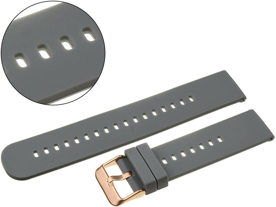 Silikonowy pasek do zegarka Pasuje do modelu SmartWatch oraz zegarków kwarcowych, gdzie szerokość mocowania paska wynosi 18 mm Pasek silikonowy. Klamerka stalowa w kolorze różowozłotym. Materiał: Tworzywo. Kolorystyka: Kolor ciemnoszary. Wymiary: szerokość mocowania: 18 mm szerokość przy kopercie: 18 mm długość części z klamerką: 86 mm długość części z dziurkami: 120 mm