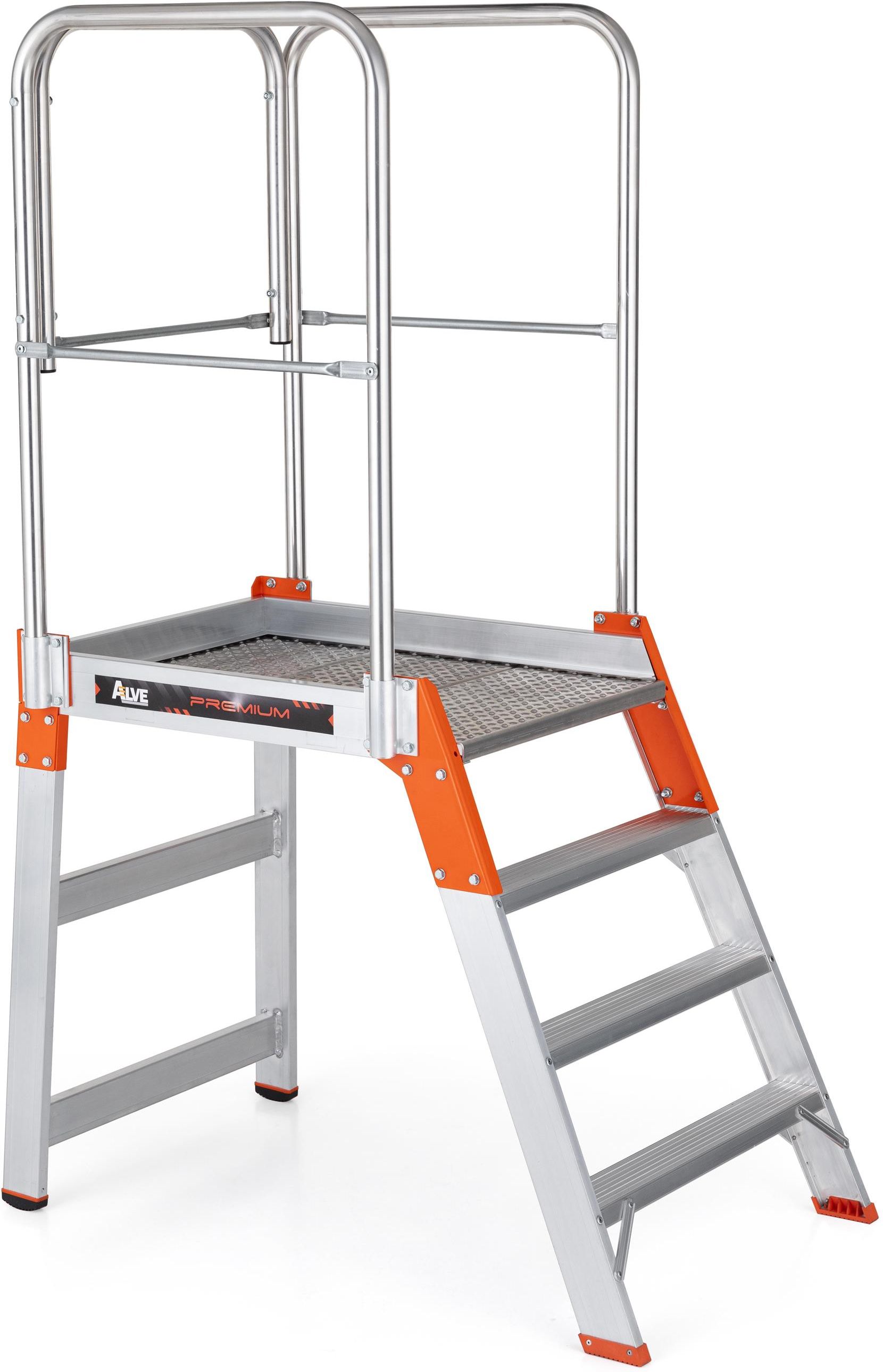 Mostek jednostronny ALVE profesjonalny. ▪ Dostępne modele 1x3 - 1x8 stopni. ▪ Wysokiej jakości mostek aluminiowy PREMIUM. ▪ Platforma wykonana jest z antypoślizgowego aluminiowego profilu, dzięki czemu pomost wytrzymuje najcięższe warunki eksploatacyjne i atmosferyczne. ▪ Bardzo duży podest (560 x 778 mm). ▪ Modele 1x5 - 1x8 wyposażone są w stabilizator. ▪ Wyjątkowo mocna konstrukcja. ▪ Wysoka poręcz zabezpieczająca znajdująca się z trzech stron podestu. ▪ Szerokie, wygodne i stabilne stopnie. ▪ Stopki zapobiegające poślizgowi drabiny. ▪ Seria profesjonalna. ▪ Maksymalne obciążenie 150 kg. ▪ Zgodność z EN-131. Certyfikat TUV. ▪ Gwarancja producenta: 7 lat na całą drabinę. ▪ Koła dostępne jako akcesoria dodatkowe.