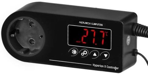 HyperionX Controller:- grzanie (termostat)- chłodzenie (termostat)- histereza- opóźnienieHyperion X Controller - więcej o funkcjach:- Termostat:Kanał wyjściowy scalony jest z termostatem mikroprocesorowym. Oznacza to, że może regulować temperaturę wewnątrz terrarium/akwarium/gworbox'ie i innych. Termostat może podnosić temperaturę lub obniżać ją, za pomocą odpowiednich urządzeń.- Histereza:Ustal histerezę. Czyli dopuszczalną różnicę temperatur jaka może mieć miejsce w Twoim terrarium.- Opóźnienie:Zamiast histerezy możesz zaprogramować opóźnienie z jakim włączy się urządzenie grzewcze. Budowa Hyperion X Controller:- Sonda:Za pomiar temperatury odpowiedzialna jest sonda o małych gabarytach. Czujnik ten umieszczony jest na przewodzie o sporej długości - 150cm.- Wyświetlacz LCD:umieszczony jest tu z obok gniazda. Duże wyświetlane cyfry ułatwiają programowanie i odczyt danych.- System scalony - mikroprocesory Andromeda Computers:Działanie i programowanie akcesorium obsługiwane jest przez wysokiej klasy podzespoły elektroniczne, w tym procesory i układy scalone produkowane przez Andromeda Computers. Układ ten gwarantuje niezawodność, precyzję działania, stabilność i komfort programowania.- Uniwersalne gniazdo 230VHyperion wyposażony jest w uniwersalne gniazdo żeńskie. Pasują do niego nie tylko Polskie czy Europejskie wtyczki. Andromeda Computers skąd się wzięli ?Producent podzespołów elektronicznych zakupił możliwość wykonywania termostatów / higrostatów / i programatorów elektronicznych. "Włożyli" do środka swoją sprawdzoną technologię. W ten sposób na rynku, nie tylko zoologicznym, pojawiły się nowe urządzenia. Dane techniczne:- zakres temperatur od 16 do 42st.C- rozdzielczość temperatury: 0,1st.C- dokładność: +/- 1ºC- zakres histerezy: od 0 do 5 st.C- zakres opóźnienia: 0 - 150 sekund- pobór mocy: 3 W- maksymalna moc podłączanych urządzeń: 1100 W- długość kabla z sondą: 150cm- wymiary sondy: 8 x 40mm- długość kabla zasilającego: 100cm