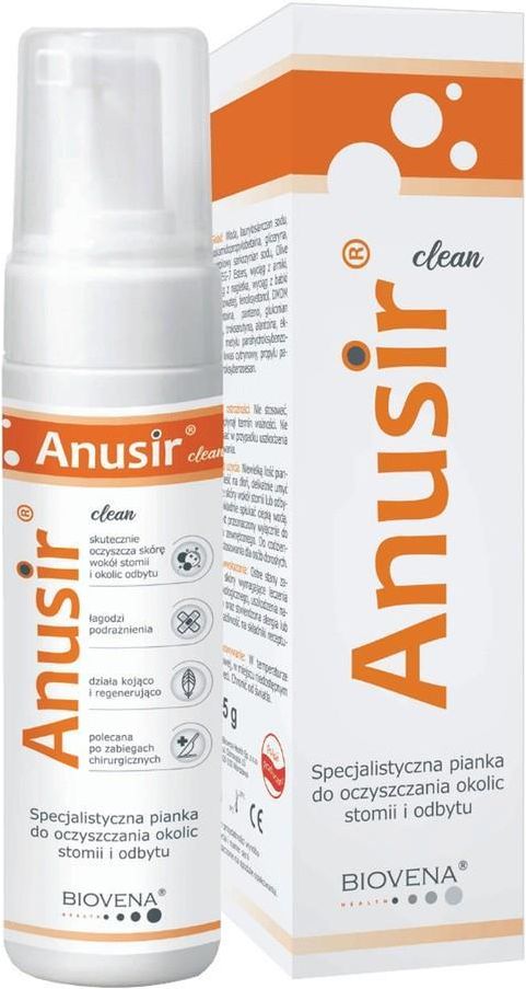 Anusir Clean Specjalistyczna pianka oczyszczająca, 225 g Anusir Clean to kosmetyk w postaci pianki do codziennej higieny i pielęgnacji delikatnej skóry okolic odbytu, dedykowany zwłaszcza dla osób ze skłonnością do podrażnień i dyskomfortu. Produkt przeznaczony dla osób dorosłych. …