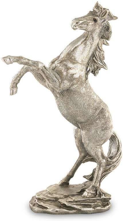 Figurka konia, wykonana z wysokiej jakości tworzywa sztucznego (konglomerat ceramiczno-alabastrowy), imitującego metal w kolorze srebra z odrobiną złota. Niezwykła figura srebrnego konia, zdobionego delikatnie rytym motywem. Najlepszy pomysł na niepowtarzalny prezent dla miłośnika jeździectwa, hodowcy koni czy dżokeja. Powierzchnia malowana, celowo postarzana w stylistyce shabby chic przez przecieranie, niewielkie nierówności, domalowania, przemalowania. Ręczne wykonanie tych zabiegów sprawia, że każdy egzemplarz ma unikatowy charakter. Wymiary: wysokość 29 cm długość 20 cm szerokość cm podstawa 12 x 7 cm waga ok. 0,9 kg