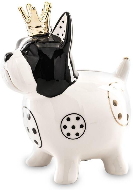Elegancka skarbonka w kształcie psa z koroną w modnych kolorach biało-czarno-złotych. Idealna jako funkcjonalna ozdoba wnętrza i świetny pomysł na prezent! Cechy produktu: Rodzaj: skarbonka w formie figurki psa z koroną Kolor: biało-czarno-złoty (błyszczące wykończenie) Materiał: wysokiej jakości ceramika Wymiary: wysokość 18 cm, długość 15 cm, głębokość 9,5 cm Dostęp do zawartości: od spodu znajduje się praktyczna zaślepka