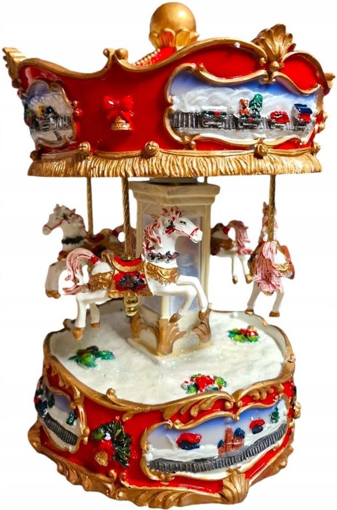 Pozytywka 155889 Pozytywka karuzela świąteczna – konie 🎶 Melodia "Jingle Bells" ❄️ 26x19x19 cm Wprowadź do swojego wnętrza prawdziwą magię świąt ✨. Ta wyjątkowa pozytywka w formie świątecznej karuzeli to dekoracja, która zachwyci swoim bogactwem detali i eleganckim wykonaniem. Karuzela ozdobiona …