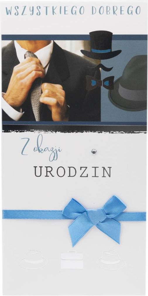 Kartka okazjonalna z życzeniami oraz białą kopertą opleciona niebieską wstążką z kolekcji SatyNovej Wyraź swoje uczucia i życzenia za pomocą tej pięknej kartki okazjonalnej. Kartka wykonana jest z wysokiej jakości tektury, co sprawia, że jest trwała i elegancka. Motyw eleganckiego mężczyzny …