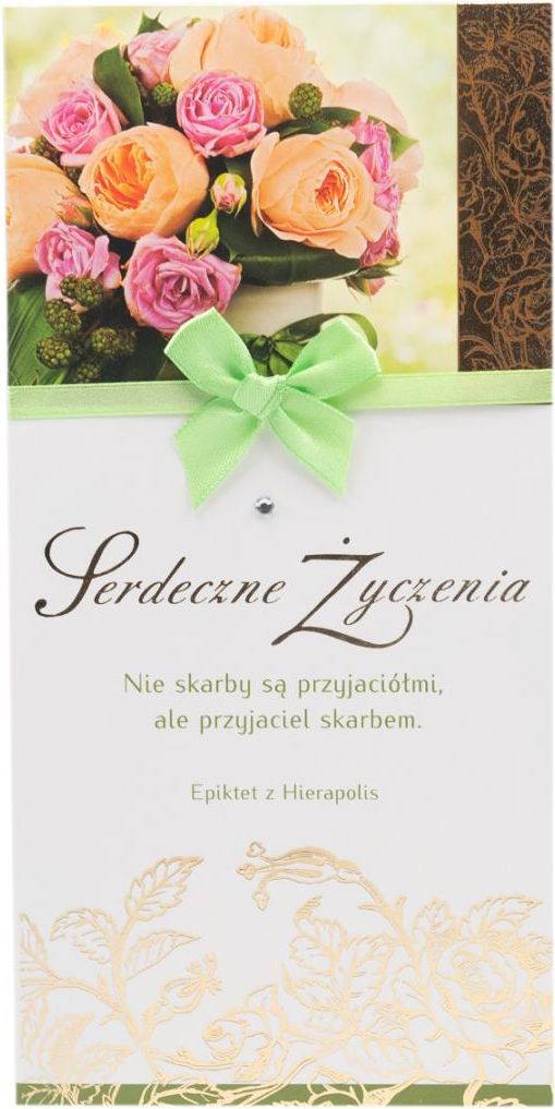 Kartka okazjonalna z życzeniami oraz kopertą opleciona zieloną wstążką z kolekcji SatyNovej Wyraź swoje uczucia i życzenia za pomocą tej pięknej kartki okazjonalnej. Kartka wykonana jest z wysokiej jakości tektury, co sprawia, że jest trwała i elegancka. Jej różany motyw dodaje uroku i sprawi, że odbiorca poczuje się wyjątkowo. Karnet daje Ci możliwość wyrażenia swoich uczuć w szczególny sposób. Wewnątrz kartki widnieją napisane już życzenia: "Słońca, kwiatów, pomyślności, zdrowia, sił i wytrwałości. Wielkich marzeń, pomyślnego biegu zdarzeń, aby szczęście Ci sprzyjało i życzenia Twe spełniało." . Pod życzeniami znajduje się miejsce na wpisanie własnych słów czy dedykacji. Możesz napisać kilka serdecznych słów lub stworzyć osobistą wiadomość dla bliskiej osoby. Ta kartka okazjonalna to idealny sposób na przekazanie życzeń z różnych okazji - od urodzin po święta czy rocznice. Może być zarówno osobistym podarunkiem dla bliskiej osoby, jak i dodatkiem do większego prezentu. Zamów teraz tę piękną kartkę okazjonalną i spraw radość swoim najbliższym! Bądź oryginalny w wyrażaniu swoich uczuć! Wzór: SNV-ZO-0383 WSTĄŻKA ZIELONA Produkt 1 x kartka 1 x koperta Wymiary kartka długość: 21,5 cm kartka szerokość: 10,6 cm Materiał tektura Użytkowanie prezent na różne okazje