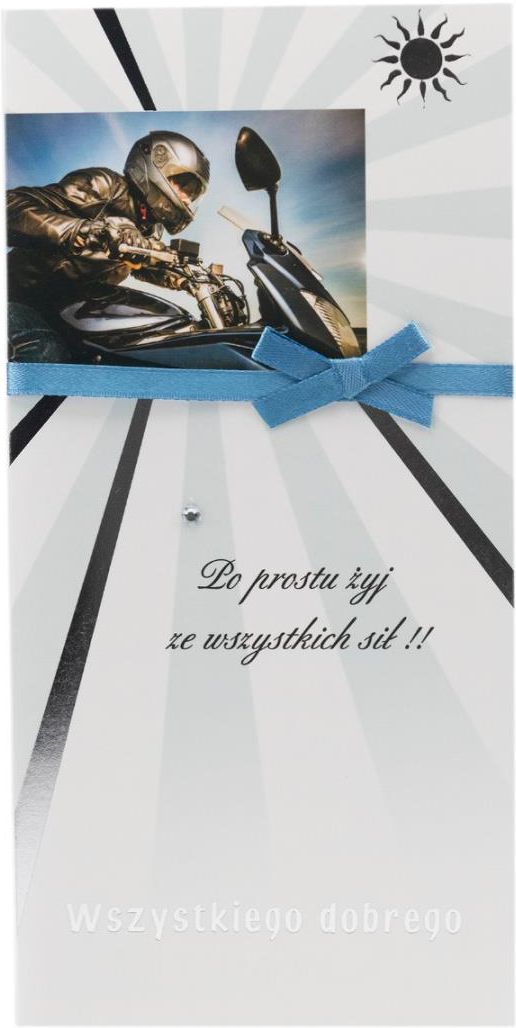Kartka okazjonalna z życzeniami oraz białą kopertą opleciona niebieską wstążką z kolekcji SatyNovej Wyraź swoje uczucia i życzenia za pomocą tej pięknej kartki okazjonalnej. Kartka wykonana jest z wysokiej jakości tektury, co sprawia, że jest trwała i elegancka. Motyw motocykla symbolizuje …