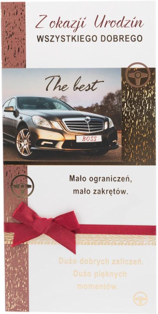 Kartka okazjonalna z życzeniami oraz białą kopertą opleciona bordową wstążką z kolekcji SatyNovej Wyraź swoje uczucia i życzenia za pomocą tej pięknej kartki okazjonalnej. Kartka wykonana jest z wysokiej jakości tektury, co sprawia, że jest trwała i elegancka. Motyw samochodu symbolizuje równowagę …