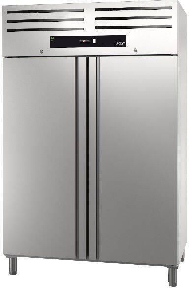 Szafa chłodnicza nierdzewna 1400l. Wykonana z wysokiej jakości stali nierdzewnej przeznaczonej do profesjonalnego użytkowania. Poliuretanowa, wtryskiwana pod wysokim ciśnieniem izolacja termiczna ścian o grubości 60 mm i wysokiej gęstości 40kg/m3, wolna od CFC. Samozamykające drzwi wyposażone w zamek, automatyczne domykanie poniżej 90o, maksymalny kąt otwarcia 120o. Drzwi wyposażone w wygodny uchwyt na całej długości. Dwustronne zawiasy oraz magnetyczna uszczelka. Dno szafy wykonane z pojedynczego, tłoczonego arkusza blachy. Nóżki z możliwością regulacji od 12,5cm - 20cm. Możliwość dokupienia kółek jezdnych oraz pedała otwierającego drzwi. Szafa posiada 3 półki z możliwością montowania na 23 poziomach, wyjmowane prowadnice. Półki o nośności 40 kg każda. Szafa dostosowana do pojemników gastronomicznych GN 2/1 lub 2x GN 1/1. Każde duże drzwi wyposażone w 3 półki epoksydowe GN 2/1 lub małe drzwi wyposażone w 1 półkę epoksydową GN 2/1. Otwory wentylacyjne w przednim panelu poprawiają estetykę oraz utrzymują odpowiednie warunki dla systemu chłodzenia dzięki czemu działa bardziej wydajnie. Bezobsługowy skraplacz posiada specjalną konstrukcję. Parownik z wymuszonym obiegiem powietrza, pokryty powłoką antykorozyjną. automatyczne odparowanie skroplin. Odzyskiwany z kompresora gorący gaz pozwala na automatyczne ogrzanie i wyparowanie skroplin, bez użycia dodatkowych elementów grzewczych, oszczędzając dzięki temu energię oraz skracając o połowę czas rozmrażania. Czynnik chłodniczy: R600a. Zakres temperatury pracy od -2oC do +8oC w IV klasie klimatycznej. Zasilanie: 230V 1+N- 50Hz. Uwaga: Towar na zamówienie.