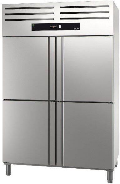 Szafa chłodnicza nierdzewna 1400l. Szafa posiada posiada 4 pary drzwi 1/2. Wykonana z wysokiej jakości stali nierdzewnej przeznaczonej do profesjonalnego użytkowania. Poliuretanowa, wtryskiwana pod wysokim ciśnieniem izolacja termiczna ścian o grubości 60 mm i wysokiej gęstości 40kg/m3, wolna od CFC. Samozamykające drzwi wyposażone w zamek, automatyczne domykanie poniżej 90o, maksymalny kąt otwarcia 120o. Drzwi wyposażone w wygodny uchwyt na całej długości. Dwustronne zawiasy oraz magnetyczna uszczelka. Dno szafy wykonane z pojedynczego, tłoczonego arkusza blachy. Nóżki z możliwością regulacji od 12,5cm - 20cm. Możliwość dokupienia kółek jezdnych oraz pedała otwierającego drzwi. Szafa posiada 3 półki z możliwością montowania na 23 poziomach, wyjmowane prowadnice. Półki o nośności 40 kg każda. Szafa dostosowana do pojemników gastronomicznych GN 2/1 lub 2x GN 1/1. Każde duże drzwi wyposażone w 3 półki epoksydowe GN 2/1 lub małe drzwi wyposażone w 1 półkę epoksydową GN 2/1. Otwory wentylacyjne w przednim panelu poprawiają estetykę oraz utrzymują odpowiednie warunki dla systemu chłodzenia dzięki czemu działa bardziej wydajnie. Bezobsługowy skraplacz posiada specjalną konstrukcję. Parownik z wymuszonym obiegiem powietrza, pokryty powłoką antykorozyjną. automatyczne odparowanie skroplin. Odzyskiwany z kompresora gorący gaz pozwala na automatyczne ogrzanie i wyparowanie skroplin, bez użycia dodatkowych elementów grzewczych, oszczędzając dzięki temu energię oraz skracając o połowę czas rozmrażania. Uwaga: Towar na zamówienie.