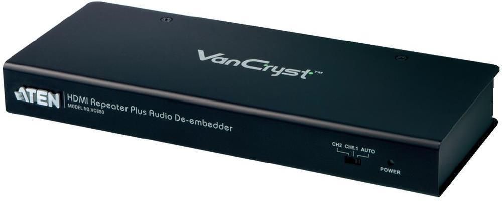 Extender HDMI Wzmacnia sygnał wejściowy HDMI dla ścieżek transmisji maksymalnie do 15 m Rozdzielczości do 1920 x 1080 (1080p) Wyodrębnia sygnał audio HDMI i udostępnia go jako oddzielne źródło dźwięku VC880 to wzmacniacz HDMI, który może jednocześnie rozdzielać i oddzielnie wyprowadzać sygnał dźwiękowy z wejściowego sygnału HDMI. Oznacza to, że oprócz ulepszonego sygnału audio i wideo HDMI można wybrać analogowy stereofoniczny sygnał audio za pomocą gniazd RCA (gniazda RCA) lub nawet cyfrowego sygnału audio za pośrednictwem wysokiej jakości połączenia światłowodowego lub koncentrycznego. VC880 obsługuje najnowsze formaty HDTV, dzięki czemu jest idealny dla każdego, kto chce oglądać treści HD, a także słyszeć dźwięk w jakości HD. Można to zrobić przez głośniki telewizora, projektor lub nawet przez odbiornik A / V lub zestaw kina domowego. Uwaga! Opis tego produktu został przetłumaczony automatycznie. Jeśli możemy poprawić go dzięki Tobie, prosimy o kontakt. Wyposażenie: Włącznik / wyłącznik dla wyjścia audio sygnału HDMI · Cyfrowe wyjście dźwiękowe przez złącze światłowodowe lub koncentryczne, a także analogowe wyjście dźwięku stereo · Kompatybilny z HDCP 1.1 · Możliwa aktualizacja oprogramowania sprzętowego · Wybór kanału audio dla 2-kanałowego, 5.1-kanałowego lub automatycznego · HDMI (3D) · Włącznik / wyłącznik dla wyjścia audio sygnału HDMI · Połączenie szeregowe do maksymalnie trzech poziomów - umożliwia wyjście audio na trzech poziomach dla sygnału HDMI w odległości do 45 m Dane techniczne: Długość produktu: 200 mm · Interfejsy wejściowe: HDMI · Interfejsy wyjściowe: HDMI · Kolor: czarny · Rodzaj produktu: Ekstender (przedłużenie) · Rodzaj transmisji ekstendera: przez kabel sygnałowy · Rozdzielczość (maks.): 1920 x 1080 px · Szerokość produktu: 82 mm · Waga: 460 g · Wysokość produktu: 25 mm · Zakres (maks.): 15 m Dostawa obejmuje: Wzmacniacz HDMI ,Zasilacz,Instrukcja obsługi. Wskazówki: HDMI® jest znakiem zastrzeżonym HDMI Licensing L.L.C.
