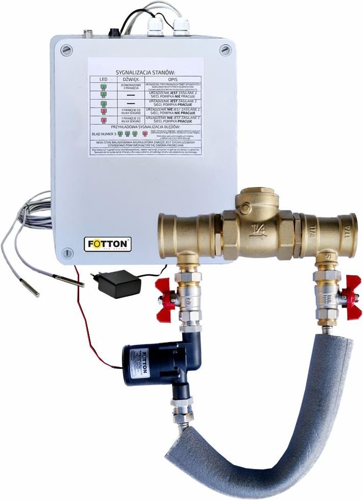 Profesjonalny awaryjny system podtrzymania obiegu do pomp ciepła typu monoblok z profesjonalną pompą prądu stałego FT5 FOTTON 12V 15W DC sterowany temperaturą otoczenia i wody, został zaprojektowany jako awaryjne wymuszenie obiegu wody w wymienniku pompy ciepła typu monoblok aby zabezpieczyć ją przed skutkami niskich temperatur. System zabezpiecza pompę ciepła przed skutkami niskich temperatur w przypadku wystąpienia braku zasilania sieciowego lub awarii pompy obiegowej znajdującej się wewnątrz pompy ciepła. W przypadku braku zasilania sieciowego w warunkach zimowych może dojść do zamarznięcia wody wewnątrz pompy ciepła co prowadzi do jej uszkodzenia. System wymagany przez producentów pomp ciepła typu monoblok w warunkach gwarancyjnych. System montuje się szeregowo w stosunku do pompy obiegowej w pompie ciepła. Punkt zasilania systemu powinien być tożsamy z punktem zasilania pompy ciepła. System ładuje akumulator i utrzymuje go w stanie pełnego naładowania. Przy niskich temperaturach system będzie uruchamiał automatycznie pompkę obiegową FOTTON FT5 podtrzymującą obieg wody w pompie ciepła do czasu podniesienia się temperatury otoczenia lub temperatury wody w obiegu w ramach energii zgromadzonej w akumulatorze. Główne cechy urządzenia • Czujnik temperatury powrotu wody przepływającej przez pompę ciepła • Czujnik temperatury otoczenia (zewnętrznej) pompy ciepła pozwalający działać systemowi tylko wtedy gdy jest to potrzebne • Inteligentny algorytm pracy pompy zwiększający efektywność wykorzystania energii akumulatora • Zaawansowany układ ładowania akumulatora, zoptymalizowany pod kątem jego trwałości z wieloma nowoczesnymi zabezpieczeniami • Integracja z systemem komunikacji C14 - możliwość podglądu stanu systemu przez wybrane urządzenia (opcja)* • Sygnalizacja świetlna oraz dźwiękowa stanów pracy • Wyjście alarmowe - przekaźnik pozwalający podłączyć zewnętrzną sygnalizację Wbudowane zabezpieczenia Test anty zwarciowy wykonywany podczas uruchomienia pompy Wewnętrzny test sprawności wykonywany przy każdym uruchomieniu oraz co 24h Zabezpieczenia ładowania i rozładowania akumulatora Urządzenie może działać w następujących trybach 1) Praca bez czujników - Urządzenie monitoruje status zasilania. W przypadku zaniku zasilania pompa anty zamrożeniowa pracuje cyklicznie. 2) Praca z czujnikami - Urządzenie monitoruje temperatury. Gdy temperatura otoczenia pompy ciepła spadnie poniżej 4 stopni, a temperatura powrotu poniżej 10 stopni, uruchomi się pompa anty zamrożeniowa. W przypadku gdy w buforze zabraknie ciepła do utrzymania odpowiedniej temperatury pompa anty zamrożeniowa będzie pracować cyklicznie zapewniając ruch wody w obiegu. 3) Praca z czujnikami i wykrywaniem braku zasilania (Opcja dodatkowa, do skonfigurowania przez moduł internetowy) - Urządzenie pracuje jak w pkt 2, ale tylko w przypadku zaniku zasilania. Obieg Bypassu pompy FOTTON FT5 wyposażono w dwa zawory które umożliwiają wymianę wężyka lub pompy w razie ich uszkodzenia bez potrzeby spuszczania wody z instalacji CO. System należy zamontować dokładnie tak jak pokazano na zdjęciu - montaż pompy w inny sposób uniemożliwi jej odpowietrzenie lub będzie działała nieprawidłowo. Ogólna uwaga - nasza podpowiedź na bazie wieloletniego doświadczenia - dotycząca obiegów CO z pompami ciepła. Jeśli w obiegu wody CO znajdują się elementy stalowe należy bezwzględnie stosować separatory z filtrami i wkładami magnetycznymi z magnesów neodymowych. Element ten jest nieodzowny aby zabezpieczyć pompy ciepła i elektroniczne pompy obiegowe znajdujące się w pompie ciepła w tym pompę FT5 przed gromadzeniem się w nich zanieczyszczeń ferromagnetycznych które prowadzą do ich uszkodzenia. Dotyczy to obecnie wszystkich pomp elektronicznych i energooszczędnych dostępnych na rynku. Jeszcze jedna praktyczna podpowiedź czego często nie mówią instalatorzy pomp ciepła, jeśli pompa ciepła ma podgrzewać wodę w zbiorniku CWU to w obiegu CO powinna się znaleźć woda pozbawiona twardości czyli zdemineralizowana lub pochodząca ze zmiękczacza. Zapobiegnie to wytrącaniu się kamienia kotłowego w wymienniku pompy ciepła, zapychaniu filtrów a na końcu utraty sprawności wymiennika a nawet jego awarii. Doskonałymi zbiornikami CWU które można tu polecić aby niwelować problemy z przepływem wody ze względu na wymienniki o dużym przekroju wykonane z gładkich rur i wysokiej jakości stali nierdzewnej są zbiorniki FOTTON 200l, 300l , 400l dostępne na naszych aukcjach. Zestaw/przesyłka zawiera: Urządzenie sterujące w obudowie z dwoma czujnikami temperatury i zasilaczem sieciowym Akumulator AGM 18Ah 1 szt Zestaw hydrauliczny z zaworem zwrotnym, mosiądz, ... jak na zdjęciu (Średnica przyłączy: 5/4") Energooszczędna profesjonalna pompka obiegowa FOTTON FT5 Zespół bypassu pompy: dwa zawory 1/2", wężyk,... jak na zdjęciu 2 szt. czujników T1 i T2 instrukcja montażu i obsługi System do samodzielnego montażu, nie zawiera innych elementów niż wyżej wymienione czyli np dłuższych przewodów itp ... . Prace przyłączeniowe i montaż powinny być wykonane wyłącznie przez osoby z odpowiednimi kwalifikacjami i uprawnieniami, zgodnie z obowiązującymi przepisami i normami. Serwis gwarancyjny i pogwarancyjny ZAPRASZAMY