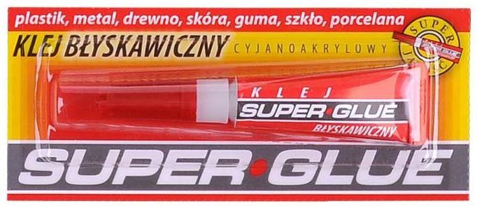 Klej błyskawiczny Super Glue Zastosowanie: Do klejenia: metalu, gumy, szkła, porcelany, ceramiki, plastiku, drewna, materiałów porowatych, itp. Wzmacnia i zabezpiecza: śrub i nakrętek, wiązań w żyłkach wędkarskich, przyrządów plastikowych Napraw: biżuterii, zabawek plastikowych, zastaw stołowych, węży gumowych Pojemność: 3 ml