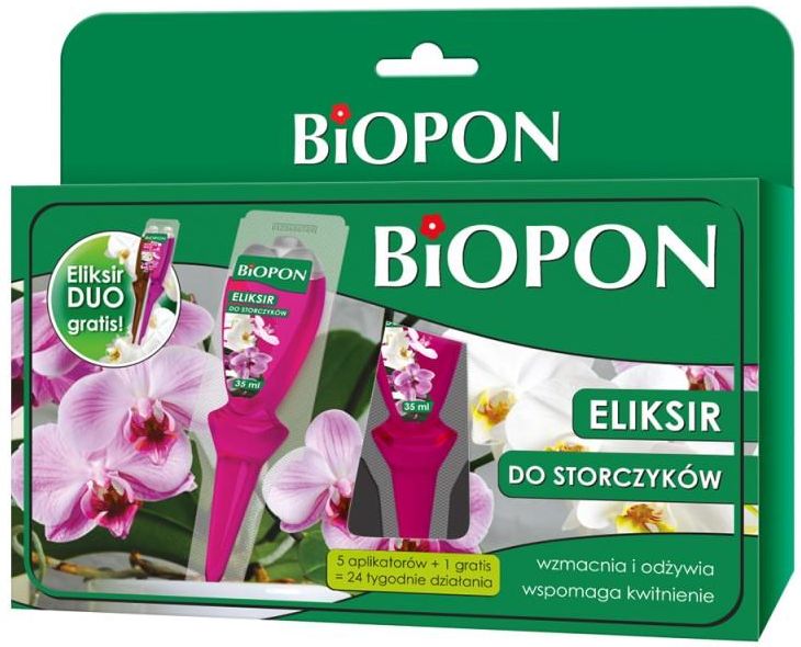 BIOPON ELIKSIR DO STORCZYKÓW Innowacyjny preparat przeznaczony do zasilania wszystkich gatunków storczyków. Jeden aplikator zaopatruje roślinę w niezbędne substancje odżywcze przez okres aż do 4 tygodni. Specjalnie dobrany skład odżywki zapewnia wyjątkowo długie i obfite kwitnienie oraz zdrowy wygląd, połysk i intensywny kolor liści. Dodatek aktywatora metabolicznego sprawia, że substancje odżywcze są łatwo i szybko przyswajane przez roślinę, a jej wzmocniony system korzeniowy działa wydajniej. Gotowa do użycia, porcjowana postać eliksiru oraz samodozujący aplikator gwarantują łatwość i wygodę stosowania.