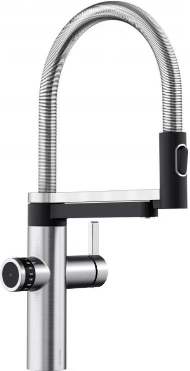 Charakterystyka produktu: Wysokiej jakości system filtrujący firmy BWT, składający się z głowicy filtra i wielostopniowego wkładu filtrującego Skrzynka sterownicza z funkcją wyświetlania pozostałej pojemności filtra Wylewka wody mieszanej obracana o 360 Oddzielna wylewka do wody filtrowanej obracana o 180 Wymagany otwór pod baterię Ø 35 mm Głowica ceramiczna Elastyczne węże oraz kolanka przyłączeniowe zapewniające łatwy i bezpieczny montaż Opatentowany regulator strumienia znacznie ograniczający osadzanie się kamienia Płyta stabilizująca ułatwiająca mocowanie baterii kuchennej w przypadku montażu w zlewozmywakach ze stali szlachetnej Producent: BLANCO Indeks: 526311 Wykończenie: PVD steel Kolor: PVD steel Rodzaj: Mieszakowa Wyciągana wylewka: TAK Typ produktu: 2-uchwytowa Kąt obrotu: 360/180 Wysokość: 447 mm Wysokość wypływu wody: 182 mm / 196 mm Zasięg wylewki: 170 mm / 252 mm Otwór montażowy: śr 35 mm Podłączenie do filtra: TAK
