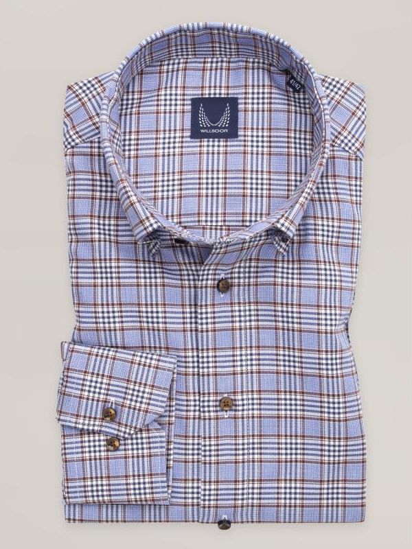 Błękitna, klasyczna koszula w białą, granatową i brązową kratkę z podpinanym kołnierzykiem
