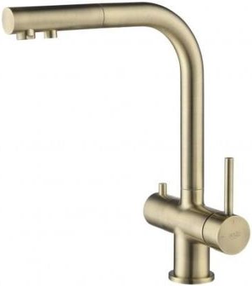 Blue Water Apala to bateria czterodrożna przeznaczona do podłączenia wody wodociągowej i filtrowanej. W baterii Apala zastosowano dwa niezależne obwody. Blue Water Apala Bateria czterodrożna w kolorze mosiądz antyczny Apala to czterodrożna bateria, zaprojektowana do podłączenia wody wodociągowej oraz filtrowanej. Bateria została wyposażona w obracaną, wyciąganą wylewkę o pełnym zakresie ruchu wynoszącym 360°. Głowice ceramiczne gwarantują cichą i wydajną pracę baterii, umożliwiają płynną i precyzyjną regulacje zarówno temperatury i natężenia przepływu, a dzięki wbudowanym perlatorom woda zostaje napowietrzona, co redukuje jej zużycie, jednocześnie zachowując pełną jakość strumienia. Posiada cztery ujęcia wody: woda ciepła oraz zimna, woda filtrowana czysta w dwóch wersjach: woda czysta i woda zmineralizowana. Model Apala zachwyca nowoczesnym designem, a jednocześnie zapewnia wygodę i funkcjonalność każdego dnia. Dwa niezależne obwody Bateria Blue Water Apala posiada dwa niezależne obwody. Prawe pokrętło umożliwia regulację temperatury poprzez mieszanie wody ciepłej i zimnej. Natomiast lewe pokrętło pozwala na korzystanie z czystej, przefiltrowanej wody, na przykład z systemu odwróconej osmozy. Dodatkowe informacje Materiał: stal nierdzewna Wykończenie: mosiądz antyczny Wylewka obrotowa do 360° Głowice ceramiczne Dwa perlatory, cztery ujęcia wody: woda ciepła oraz zimna, woda filtrowana czysta w dwóch wersjach: woda czysta i woda zmineralizowana Dwa elastyczne wężyki podłączeniowe 3/8“ – 400 mm Dwa podłączenia do filtra z szybkozłączką (do wody filtrowanej oraz zmineralizowanej) rączka mieszacza odchyla się do przodu, dzięki czemu można montować baterię pomiędzy zlewozmywakiem podwieszanym a ścianą Wymiary: rysunek techniczny baterii dostępny na dole strony produktu Rysunek techniczny baterii czterodrożnej Apala Atest higieniczny PZH
