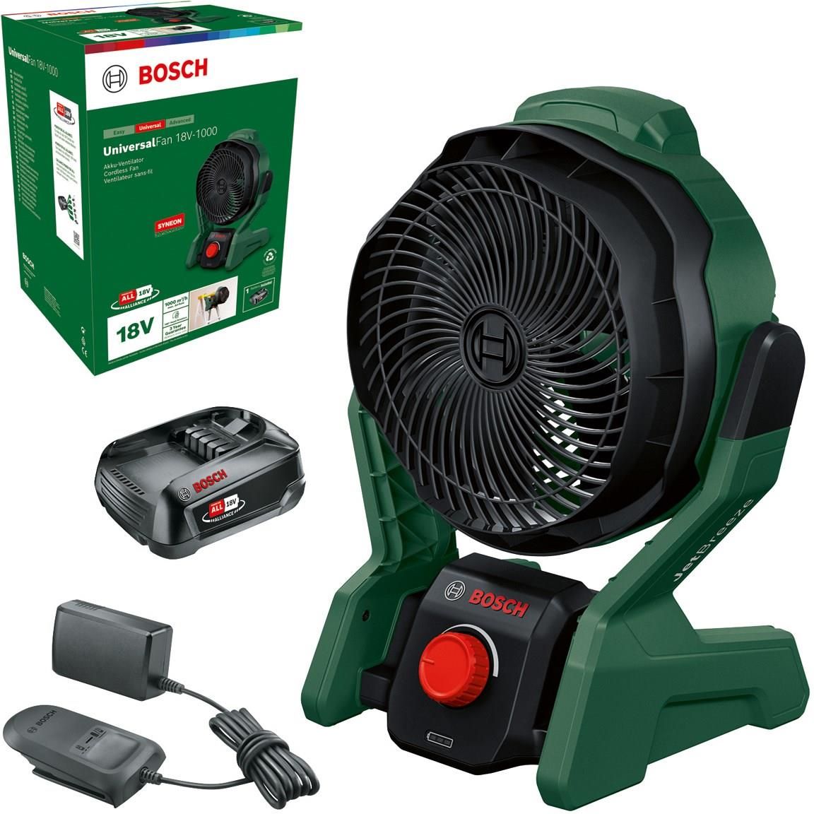 UniversalFan 18V-1000 Nowy wentylator akumulatorowy: zapewnij sobie powiew chłodnego powietrza dzięki wyjątkowej wydajności i wszechstronności Mocny nawiew, długi czas pracy i niski poziom hałasu dzięki technologii przepływu powietrza Bosch JetBreeze Regulacja głowicy wentylatora, liczne opcje …