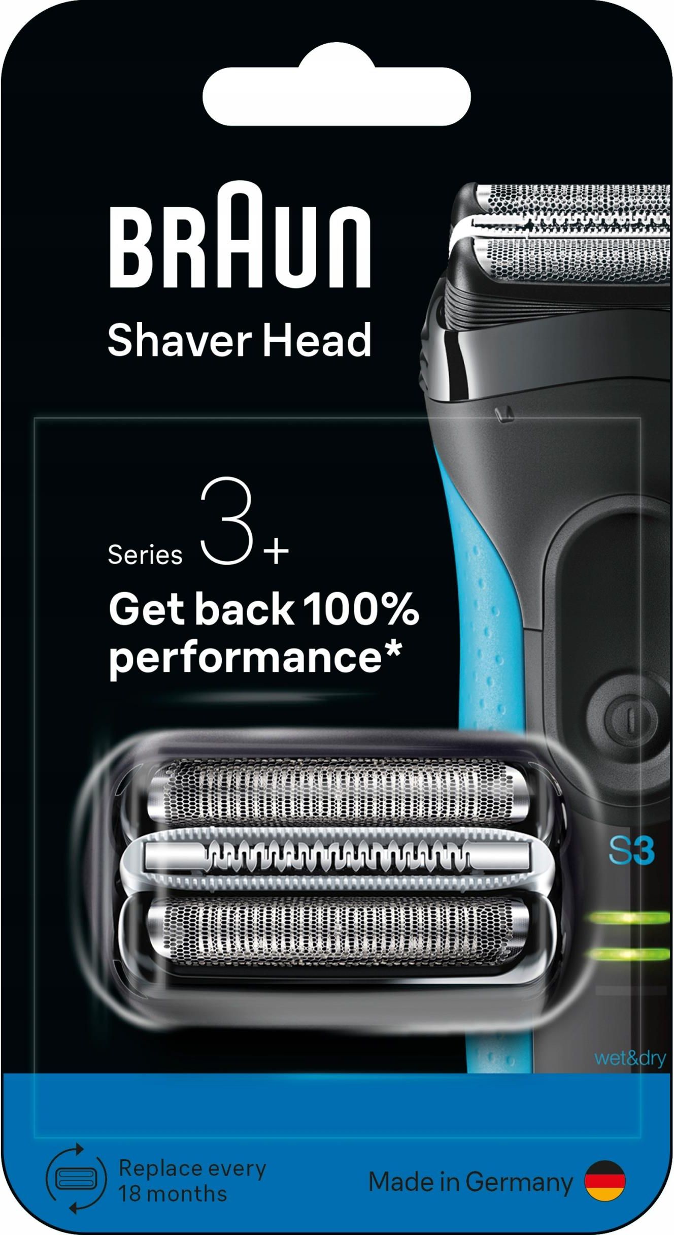 Braun ORYGINALNA zamienna głowica golarki elektrycznej Series 3+, 32B Kompatybilna ze wszystkimi generacjami golarek Series 3+ i ProSkin, łatwa wymiana „na klik” Średnio golarka Braun usuwa 6 milionów włosów co 18 miesięcy. Oznacza to, że głowica stopniowo się zużywa, a golenie staje się mniej dokładne i komfortowe. W celu przywrócenia maksymalnej wydajności golarki Braun zaleca wymianę folii i nożyków co 18 miesięcy. Jeśli będziesz dbać o swoją golarkę, będzie Ci ona dobrze służyć. ORYGINALNA część zamienna marki Braun: Wyprodukowano w Niemczech. Używaj wyłącznie oryginalnych głowic zamiennych Braun, aby zapobiec uszkodzeniu golarki Odzyskaj pełną wydajność golenia: Zalecamy wymianę głowicy golarki elektrycznej co 18 miesięcy w celu zachowania optymalnych efektów golenia Dokładne golenie: 2 precyzyjne folie i centralny trymer zapewniają staranne golenie Delikatna dla skóry dzięki technologii folii, która chroni przed skaleczeniami i zacięciami Zawartość pudełka: 1 × ORYGINALNA zamienna głowica golarki