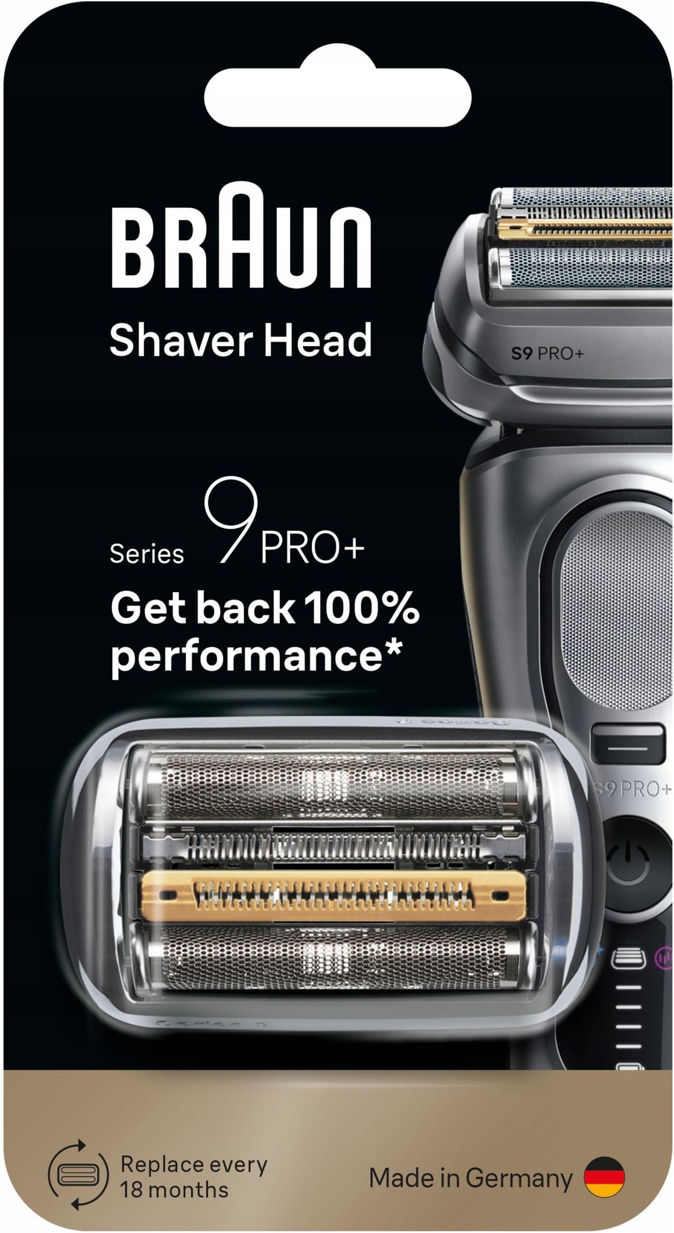 Braun Głowica zamienna golarki elektrycznej Series 9 PRO+, 96M Wyposaż swoją golarkę w najbardziej zaawansowaną głowicę Braun. Kompatybilna ze wszystkimi golarkami Series 9. Łatwa wymiana „na klik”/ Średnio golarka Braun usuwa 6 milionów włosów co 18 miesięcy. Oznacza to, że głowica stopniowo się zużywa, a golenie staje się mniej dokładne i komfortowe. W celu przywrócenia maksymalnej wydajności golarki Braun zaleca wymianę folii i nożyków co 18 miesięcy. Jeśli będziesz dbać o swoją golarkę, będzie Ci ona dobrze służyć. Zawartość pudełka: 1 × ORYGINALNA zamienna głowica golarki ORYGINALNA część zamienna marki Braun: Wyprodukowano w Niemczech. Używaj wyłącznie oryginalnych głowic zamiennych Braun, aby zapobiec uszkodzeniu golarki Odzyskaj pełną wydajność golenia: Zalecamy wymianę głowicy golarki elektrycznej co 18 miesięcy w celu zachowania optymalnych efektów golenia Zalecamy wymianę głowicy golarki elektrycznej co 18 miesięcy w celu zachowania optymalnych efektów golenia Idealna dokładność 0,00 mm: Perfekcyjnie zsynchronizowane elementy golące 5+1, które delikatnie przycinają nawet najbardziej uporczywy zarost za każdym pociągnięciem Wyjątkowa ochrona skóry: ultracienkie, precyzyjne ostrza golą skuteczniej niż jakakolwiek poprzednia golarka elektryczna Series 9, zapewniając wyjątkową ochronę skóry