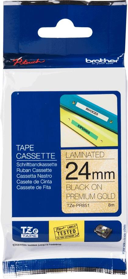 Brother TZe-PR851 Czarny tekst na złotej etykiecie premium 24 mm szerokości, 8 m długości Wysokiej jakości oryginalna kaseta Brother Zapewnia wyraźne i trwałe rezultaty Opis produktu  Brother TZe-PR851 Oryginalna laminowana taśma TZe-PR851 z czarnym nadrukiem na złotym tle jest idealna do tworzenia kartek czy pakowania prezentów. Błyszczące tło nadaje etykiecie wyjątkowy wygląd. Taśmy Brother są niezwykle trwałe i odporne na uszkodzenia dzięki specjalnej technologii laminowania. TZe-PR851 jest kompatybilna z drukarkami etykiet P-touch, które posiadają logo TZ lub TZe na pokrywie z taśmą. Kompatybilne z Brother PT-1280YJ, PT-2420PC, PT-2450DX, PT-2460, PT-2480, PT-9500PC, PT-9600, PT-2700, PT-3600, PT-1280DT + przybornik, PT-1280VP + walizka, PT-2430PC, PT-1290DT, PT-2730VP. Więcej informacji o produkcie  Brother TZe-PR851 Taśma premium TZe-PR851 była poddana rygorystycznym testom w celu otrzymania trwałej i niezawodnej etykiety. Niezależnie od tego, czy chcesz opisywać pliki, foldery w swoim biurze, tworzyć plakietki z nazwiskami, tabliczki z trofeami, czy tworzyć etykiety dla produktów robionych ręcznie, ta taśma zapewni doskonały wygląd każdego produkowanego znakowania. Złożona z wielu warstw, laminowana taśma TZe-PR851 umożliwia tworzenie etykiet, które pozostają tak wyraźne i czytelne, jak w dniu ich wydrukowania. Opatentowana technologia laminowania sprawi natomiast, że będą one odporne na temperaturę, wodę, promienie słoneczne czy ścieranie.