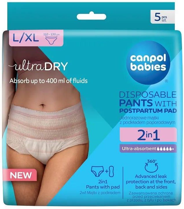 Majtki jednorazowe 2w1 Canpol babies to rewolucyjne połączenie ultrachłonnego podkładu poporodowego i oddychających majtek, które zapewniają najwyższą ochronę i komfort w pierwszych dniach po porodzie kiedy krwawienie jest najintensywniejsze. Wchłaniają aż do 400 ml płynów, gwarantując uczucie suchości. Zaawansowana ochrona 360o przed przeciekaniem zapewnia pełną ochronę z przodu, z tyłu i po bokach, również w pozycji leżącej. Oddychająca konstrukcja pozwala skórze swobodnie oddychać, minimalizując ryzyko podrażnień, a wyjątkowo miękka warstwa wewnętrzna jest bezpieczna nawet dla wrażliwej skóry. Elastyczny pas w talii doskonale dopasowuje się do różnych sylwetek, a wysoki stan majtek jest delikatny dla blizny po cesarskim cięciu. Niebielone chlorem i zapakowane w pojedynczy woreczek dla zapewnienia odpowiedniej higieny. Szwy boczne są rozrywalne, co ułatwia zdejmowanie. Majtki 2w1 stanowią niezastąpione wsparcie dla każdej kobiety po porodzie, oferując skuteczną ochronę, komfort oraz poczucie świeżości przez cały dzień. Majtki mogą być również pomocne dla kobiet z obfitymi miesiączkami oraz osób z problemem nietrzymania moczu. Rozmiar L/XL jest odpowiedni dla kobiet o obwodzie bioder od 110 do ok. 130 cm. W opakowaniu znajduje się 5 sztuk. 2w1 Ultrachłonny podkład i oddychające majtki w jednym. Ultrachłonne Wchłaniają aż do 400 ml płynów i zapewniają uczucie suchości. Oddychające Umożliwiają swobodny przepływ powietrza i nie podrażniają skóry. Wyjątkowo miękka warstwa wewnętrzna Odpowiednia również dla skóry wrażliwej. Zaawansowana ochrona przed przeciekaniem Z przodu, z tyłu i po bokach. Bardzo elastyczny i rozciągliwy pas w talii Dopasowuje się do różnych sylwetek i zapewnia wygodę użytkowania. Wysoki stan Delikatny dla blizny po cesarskim cięciu. Dodatkowe informacje Majtki o kroju przypominającym klasyczną bieliznę, łączące funkcję majtek i podkładu poporodowego w jednym produkcie. Majtki są przeznaczone dla kobiet w pierwszych dobach po porodzie lub podczas menstruacji, a także przy problemach z nietrzymaniem moczu. Opakowanie zawiera 5 sztuk. Uwaga, ważne informacje: Majtki zmieniaj regularnie. Zużyty produkt wyrzuć do kosza na śmieci. Produkt do jednorazowego użytku. Produkt nie jest przeznaczony dla dzieci.