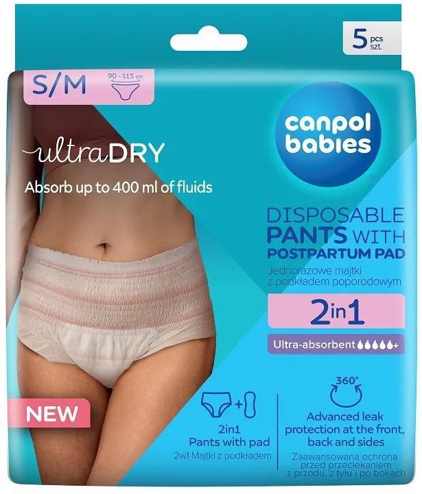 Majtki jednorazowe 2w1 Canpol babies to rewolucyjne połączenie ultrachłonnego podkładu poporodowego i oddychających majtek, które zapewniają najwyższą ochronę i komfort w pierwszych dniach po porodzie kiedy krwawienie jest najintensywniejsze. Wchłaniają aż do 400 ml płynów, gwarantując uczucie suchości. Zaawansowana ochrona 360o przed przeciekaniem zapewnia pełną ochronę z przodu, z tyłu i po bokach, również w pozycji leżącej. Oddychająca konstrukcja pozwala skórze swobodnie oddychać, minimalizując ryzyko podrażnień, a wyjątkowo miękka warstwa wewnętrzna jest bezpieczna nawet dla wrażliwej skóry. Elastyczny pas w talii doskonale dopasowuje się do różnych sylwetek, a wysoki stan majtek jest delikatny dla blizny po cesarskim cięciu. Niebielone chlorem i zapakowane w pojedynczy woreczek dla zapewnienia odpowiedniej higieny. Szwy boczne są rozrywalne, co ułatwia zdejmowanie. Majtki 2w1 stanowią niezastąpione wsparcie dla każdej kobiety po porodzie, oferując skuteczną ochronę, komfort oraz poczucie świeżości przez cały dzień. Majtki mogą być również pomocne dla kobiet z obfitymi miesiączkami oraz osób z problemem nietrzymania moczu. Rozmiar S/M jest odpowiedni dla kobiet o obwodzie bioder od 90 do ok. 115 cm. W opakowaniu znajduje się 5 sztuk. 2w1 Ultrachłonny podkład i oddychające majtki w jednym. Ultrachłonne Wchłaniają aż do 400 ml płynów i zapewniają uczucie suchości. Oddychające Umożliwiają swobodny przepływ powietrza i nie podrażniają skóry. Wyjątkowo miękka warstwa wewnętrzna Odpowiednia również dla skóry wrażliwej. Zaawansowana ochrona przed przeciekaniem Z przodu, z tyłu i po bokach. Bardzo elastyczny i rozciągliwy pas w talii Dopasowuje się do różnych sylwetek i zapewnia wygodę użytkowania. Wysoki stan Delikatny dla blizny po cesarskim cięciu. Dodatkowe informacje Majtki o kroju przypominającym klasyczną bieliznę, łączące funkcję majtek i podkładu poporodowego w jednym produkcie. Majtki są przeznaczone dla kobiet w pierwszych dobach po porodzie lub podczas menstruacji, a także przy problemach z nietrzymaniem moczu. Opakowanie zawiera 5 sztuk. Uwaga, ważne informacje: Majtki zmieniaj regularnie. Zużyty produkt wyrzuć do kosza na śmieci. Produkt do jednorazowego użytku. Produkt nie jest przeznaczony dla dzieci.