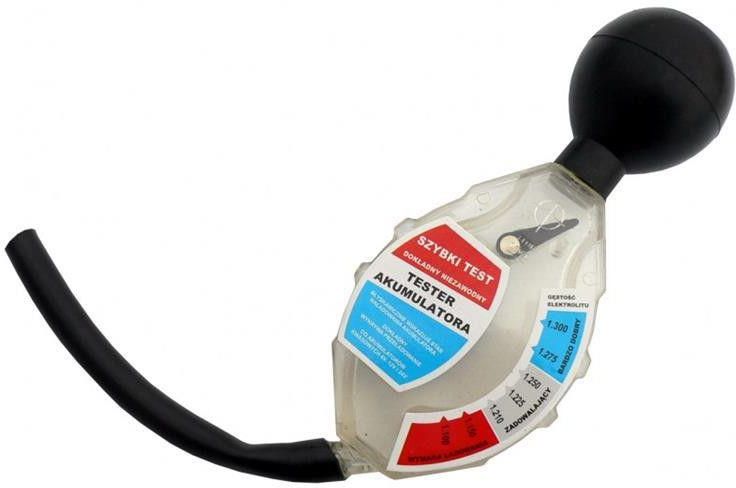 Tester akumulatora wskazówkowyOpis produktu:Areometr przeznaczony do wstępnej oceny sprawności oraz stopnia naładowania akumulatora kwasowego. Znajduje zastosowanie w diagnostyce akumulatorów wyposażonych w korki umożliwiające pobranie próbek elektrolitu niezależnie z każdej z cel.Wskazania i zalecenia:Wskazanie uzależnione jest od jego gęstości, a więc od stopnia naładowania akumulatora.NIEBIESKI obszar skali - akumulator naładowanySZARY obszar skali - akumulator częściowo rozładowany - zalecane ładowanie wyrównawczeCZERWONY obszar skali - akumulator rozładowany - konieczność naładowaniaStan: NowyOpakowanie: Blister