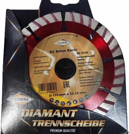 Tarcza diamentowa do cięcia betonu, 125/22.23mm, CEDIMA [EC BETON BASIC 125] segmentowa tarcza diamentowa z ostrzem do ​​szybkiego cięcia w betonie, wyrobach z betonu, piaskowcu, wapniu, może być stosowana do cięcia na sucho i mokro, PARAMETRY TECHNICZNE TARCZY DIAMENTOWEJ CEDIMA [EC BETON BASIC 125] średnica tarczy: 125 mm, średnica otworu tarczy: 22.23 mm, grubość tarczy: 2.3 mm, szerokość cięcia: 3 mm, liczba segmentów: 9, maksymalna prędkość obrotowa:12 250 obr./min., tryb pracy: na sucho lub na mokro,