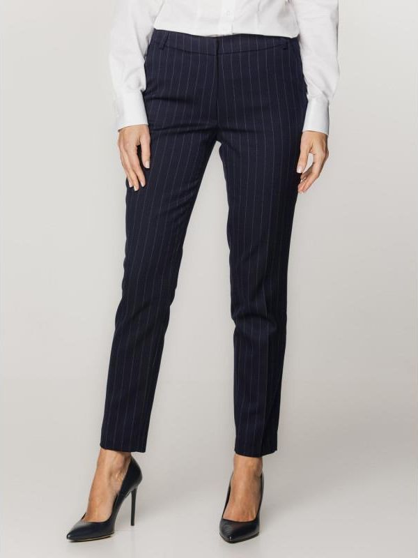 Ciemnogranatowe, klasyczne spodnie garniturowe w kontrastowe prążki z zaprasowanymi kantami i zwężanymi nogawkami