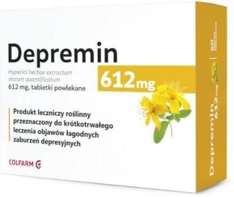 Depremin 612 mg to produkt leczniczy pochodzenia roślinnego, którego substancją czynną jest standaryzowany wyciąg z ziela dziurawca. Preparat ten przeznaczony jest dla osób odczuwających krótkotrwałe, łagodne objawy depresyjne, takie jak przygnębienie, spadek energii czy uczucie przytłoczenia. Substancje aktywne zawarte w dziurawcu mogą wpływać na poziom neuroprzekaźników, takich jak serotonina czy dopamina, pomagając przywrócić emocjonalną równowagę i łagodzić takie objawy jak obniżony nastrój, drażliwość, niepokój czy przewlekłe zmęczenie psychiczne. Depremin tabletki są przeznaczone dla osób powyżej 18. roku życia. Jeżeli po 4 tygodniach stosowania leku Depremin 612 mg nie nastąpi poprawa lub stan się pogorszy, należy skonsultować się z lekarzem.