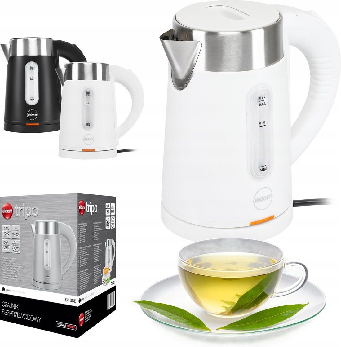 Czajnik bezprzewodowy C185B tripo Kompaktowy rozmiar, maksymalna funkcjonalność! Poznaj czajnik bezprzewodowy o pojemności 0,8 litra – idealne rozwiązanie dla osób ceniących wygodę, nowoczesny design i oszczędność miejsca. Ten niewielki sprzęt doskonale sprawdzi się w małych kuchniach, biurach, akademikach czy podczas wyjazdów. Dzięki starannie zaprojektowanej konstrukcji i praktycznym funkcjom zagotowanie wody na ulubioną herbatę czy kawę stanie się wyjątkowo szybkie i łatwe. Najważniejsze cechy ☑️pojemność 0,8 litra – idealna dla jednej lub dwóch osób ☑️kompaktowy rozmiar – oszczędność miejsca w kuchni lub biurze ☑️obrotowa podstawa 360° – wygoda użytkowania ☑️wskaźnik poziomu wody – precyzyjne odmierzenie ilości wody ☑️automatyczne wyłączanie po zagotowaniu – bezpieczeństwo i komfort ☑️zabezpieczenie przed przegrzaniem – ochrona urządzenia przed uszkodzeniem ☑️nowoczesny i uniwersalny design – estetyczny wygląd, który pasuje do każdego wnętrza Zaprojektowany z myślą o Twojej wygodzie ⏩ Czajnik został wyposażony w ergonomiczny uchwyt, który zapewnia komfort użytkowania, a obrotowa podstawa 360° umożliwia swobodne ustawianie urządzenia w dowolnej pozycji. Wskaźnik poziomu wody pozwala dokładnie odmierzyć ilość potrzebnej wody, co eliminuje zbędne straty i czyni urządzenie bardziej ekonomicznym. Automatyczne wyłączanie po zagotowaniu wody oraz zabezpieczenie przed przegrzaniem gwarantują bezpieczne użytkowanie. Stylowy dodatek do każdego wnętrza ▶ Minimalistyczny design czajnika oraz neutralna kolorystyka sprawiają, że będzie on pasował do każdej kuchni, niezależnie od jej stylu. Jest to urządzenie nie tylko praktyczne, ale również estetyczne, które wzbogaci Twoje wnętrze. Niezależnie od tego, gdzie go postawisz – w domu, w pracy czy w czasie podróży – ten czajnik stanie się Twoim niezastąpionym pomocnikiem w przygotowywaniu ulubionych napojów! Wnętrze wykonane ze stali nierdzewnej gwarantuje trwałość i higienę, a także zachowuje naturalny smak wody. Kompaktowe wymiary i lekka konstrukcja sprawiają, że łatwo zmieścisz go w każdej torbie podróżnej. Czajnik turystyczny Eldom C185 – zdrowie i wygoda w podróży! ⭐️ Podróżuj komfortowo z czajnikiem Eldom C185 o pojemności 0,8 l i mocy 1000 W. ⭐️ Dzięki wnętrzu ze stali nierdzewnej i konstrukcji BPA FREE masz pewność, że woda pozostaje wolna od szkodliwych substancji, a jej smak pozostaje naturalny. SPECYFIKACJA ✔️wykonanie: izolowana obudowa: tworzywo + stal nierdzewna ✔️płyta grzejna ✔️pojemność: 0,8 l ✔️moc: 1000W ✔️kompaktowy i lekki ✔️idealny do podróży ✔️wnętrze ze stali nierdzewnej ✔️bezpieczny w dotyku-cool touch ✔️automatyczne wyłączanie ✔️obrotowa podstawa 360° ✔️szybkie gotowanie wody ✔️ergonomiczny uchwyt ✔️zewnętrzna powłoka z tworzywa sztucznego ✔️kolor: biały ZESTAW ZAWIERA Czajnik C185B Oryginalne opakowanie Instrukcja w języku polskim Kolor czarny dostępny na innych Naszych aukcjach. Polska firma, która działa na rynku już od ponad dwudziestu lat. Zajmuje się produkcją drobnego sprzętu AGD, a jej celem jest dostarczanie Klientom praktycznych, nowoczesnych i niezawodnych produktów. Marka ELDOM jest znana i rozpoznawaną nie tylko w Polsce, ale także za granicą. Swoje produkty dostarcza do wielu krajów Europy, w tym do Hiszpanii, Czech czy Słowacji. Współpracuje z renomowanymi i sprawdzonymi fabrykami, które dysponują nowoczesnymi laboratoriami i liniami produkcyjnymi. Od początku swego istnienia stawia na praktyczny i funkcjonalny sprzęt oraz na jak najlepszy stosunek jakości do ceny. Eldom dba o jakość stosowanych materiałów oraz o wysokie standardy bezpieczeństwa i zgodność z obowiązującymi normami. Produkowane urządzenia wykonane są z materiałów, które mogą być poddane ponownemu przetwarzaniu lub recyklingowi.