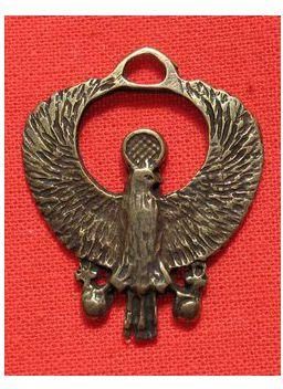 Przewodnik duszy - chroniący przed rozterkami i niezdecydowaniem, dający nadzieję. Egipski Sęp Królewski niosący słoneczny dysk był godłem Górnego Egiptu i znakiem bogini Nechbet. Był strażnikiem boskich przywilejów, miejsca w hierarchii społecznej i powierzonych mu pod ochronę dusz, które ochrania rozpostartymi skrzydłami. Uznawany był za zwierzę świete, symbolizujące duszę boską i ludzką, która tylko przelotnie gości w ciele każdego żyjącego. Sęp wyrażał symbolicznie liczne aspekty duszy ludzkiej, takie jak uczucia i tęsknotę do lepszego świata. Noszony jako symbol miał zapobiegać chorobom duszy i prowadzić ją przez życie i po śmierci tak, alby ostatecznie trafiła do raju. Znak ten miał przemieniać każde zło w dobro. Wymiary: 3,4 x 2,7 cm Materiał: Stop metali kolorowych Rzemyk gratis!!!