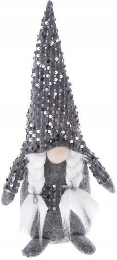 Filcowy skrzat szary stojący figurka prezent święta ozdoba (15062) Wyjątkowa, stojąca figurka wykonana z materiału tzw. filcu w kształcie skrzata. Wysokość figurki 41 cm. Uroczy szary krasnal, z długimi białymi włosami, szarą czapką zdobioną cekinami prezentuje się zjawiskowo. Skrzat ozdobiony jest szarym pasem z cekinami. Święta nierozdzielnie kojarzą nam się ze śniegiem, bałwanem, choinką, ozdobami, prezentami. Każdy z nas lubi upiększać swój dom na ten wyjątkowy czas, dlatego skrzat idealnie wpasuje się do naszej aranżacji i przykuje niejedno spojrzenie. Skrzat wprowadzi świąteczną atmosferę i otoczy nasz dom dobrą aurą. Postawiony obok choinki będzie jej doskonałym dopełnieniem. Wzór: skrzat szary Produkt 1 x skrzat materiałowy Wymiary wysokość 41 cm średnica dolna 12 cm Materiał tkanina