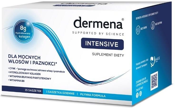Dermena Intensive mocne włosy paznokcie 15 saszetek x 20ml Suplement diety Dermena INTENSIVE suplement diety zawiera starannie dobraną kompozycję składników uzupełniających codzienną dietę w hydrolizowany kolagen, cynk, witaminę B5/kwas pantotenowy i witaminę B6. BEZ CUKRU BEZ GLUTENU Działanie …