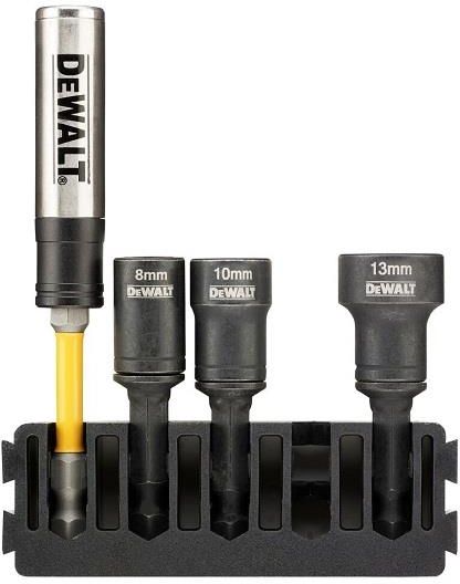 Zestaw udarowych końcówek nasadowych z magnetycznym uchwytem do bitów 1/4", DeWALT [DT70827-QZ]: zestaw 3 sztuk udarowych końcówek nasadowych z magnetycznym trzpieniem 1/4" do śrub w rozmiarach 8 / 10 / 13 mm + magnetyczny udarowy uchwyt do bitów 1/4", można rozłączyć nasadkę od trzpienia, co …