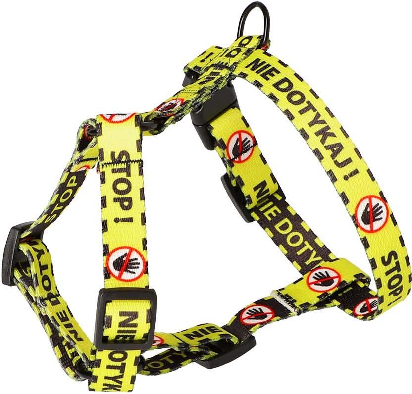 SZELKI TYPU GUARD "NIE DOTYKAJ" DLA PSA Rozmiar S Obwód klatki piersiowej za przednimi łapami: 24 - 45 cm Obwód szyi psa: 22 - 35 cm Szelki guard dla psa z taśmy "NIE DOTYKAJ" są stworzone z myślą o psiakach, które po prostu nie chcą być dotykane na spacerach. Wyraźny nadruk na taśmie sprawia, że napis, jak i znaki, są bardzo widoczne. Odczytanie przekazu jest więc bardzo łatwe! Żółte szelki dla psa są regulowane bezstopniowo w 3 miejscach: po dwie sprzączki do regulacji na obwodzie szyi pupila, regulacja bezstopniowa na taśmie za przednimi łapami pupila. Szelki typu guard są idealne dla wszystkich psów, ponieważ nie krępują ruchów pupila i ciężko się z nich wyswobodzić. Sprawdzą się podczas codziennych spacerów. Dzięki ich specjalnej konstrukcji nadają się też jako szelki dla szczeniaka! Solidne okucia i mocne zapięcia gwarantują, że Twój pies będzie w nich bezpieczny. Szelki guard sprawnie zakłada się przez głowę pupila, zapinając na wygodną klamrę za przednimi łapami.