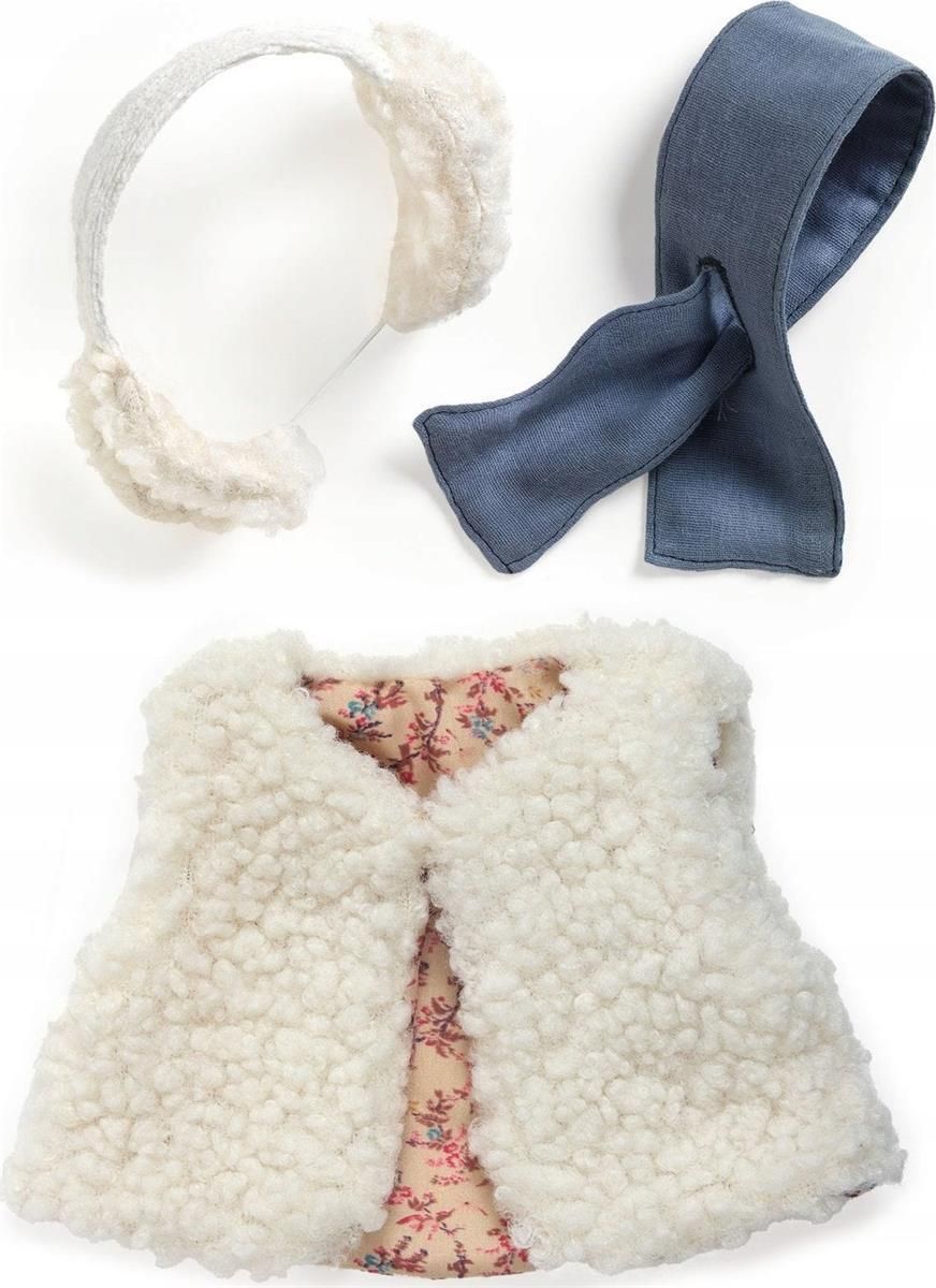 Modny zimowy outfit zaprojektowany we współpracy ze stylistką - specjalnie dla lalek Pomea. W zestawie znajduje się kamizelka z podszewką w kwiatowy wzór z materiału imitującego wełnę, nauszniki oraz granatową apaszkę. Akcesoria przeznaczone dla lalek o wymiarach 28-34 cm. Zalecane pranie ręczne. …