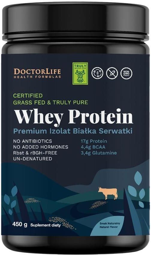 DoctorLife, Whey Protein – suplement diety w postaci proszku zawierający izolat białka serwatki z mleka krowiego. Produkt przeznaczony dla osób dorosłych. Smak neutralny.