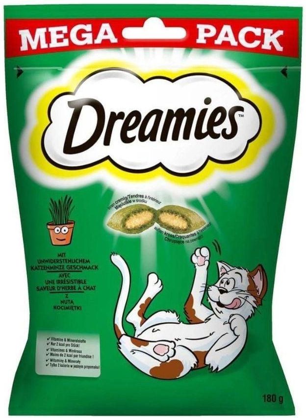 Dreamies Mega Pack 4x180g Przysmak Dla Kota z Nutą Kocimiętki Dreamies™ z nutą kocimiętki to wyśmienite chrupiące paszteciki z miękkim nadzieniem dla kotów powyżej 8. tygodnia życia. Ich skład został opracowany przez specjalistów ds. żywienia i lekarzy weterynarii z Instytutu Nauki o Zwierzętach WALTHAM, dzięki czemu przysmaki Dreamies™ nie tylko mają doskonały smak, ale są także są wzbogacone minerałami i witaminami.Paszteciki Dreamies™ są doskonałą przekąską, którą mile zaskoczysz swojego kociego przyjaciela. POTRZĄŚNIJ opakowaniem i zobacz, jak przybiega Twój kot! Korzyści: Bez sztucznych aromatów. Jeden pasztecik Dreamies zawiera tylko 2 kcal. Zdrowie i witalność dzięki zawartym w Dreamies witaminom i minerałom. Skład: zboża, produkty pochodzenia roślinnego, oleje i tłuszcze, mięso i produkty pochodzenia zwierzęcego, roślinne ekstrakty białkowe, substancje mineralne. Kaloryczność: 416 kcal/100 g Dodatki / 1 kg: Przeciwutleniacze i barwniki; Dodatki dietetyczne: Witamina A: 1293 IU, Witamina B1: 9,9 mg, Witamina B2: 16,9 mg, Witamina B6: 4,4 mg, Witamina D3: 143 IU, Witamina E: 115 mg, Miedź (Siarczan miedzi (II), pięciowodny): 6,1 mg, Jod (Jodek potasu): 1,5 mg, Mangan (Siarczan manganawy jednowodny): 14,1 mg, Cynk (Siarczan cynku jednowodny): 70,5 mg. Dodatki sensoryczne: Aromat kocimiętki: 11,9 mg. Składniki analityczne (%): białko: 22; zawartość tłuszczu: 22; materia nieorganiczna: 8; włókno surowe: 2. SPOSÓB KARMIENIAZalecana dzienna ilość karmy W przypadku kotów dorosłych, podawać do 20 sztuk dziennie. W przypadku kociąt powyżej 8 tygodnia życia, podawać do 6 sztuk dziennie. Proszę odpowiednio zmniejszyć dawkę głównego posiłku. Przechowywać w suchym i chłodnym miejscu. Po otwarciu opakowania przechowywać szczelnie zamknięte i zużyć w ciągu 8 tygodni. Pamiętaj, aby zapewnić zwierzęciu stały dostęp do świeżej wody do picia.