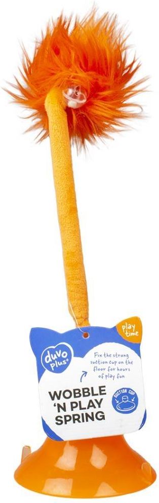 *DUVO+ Wobble 'n Play* to zabawka dla kota zapewniająca długą zabawę. Wystarczy za pomocą przyssawki zamontować ją na równej powierzchni lub szybie. Dzięki wykorzystaniu sprężyny za każdym razem gdy kot złapie za pompon, zabawka zacznie się ruszać i ciągnąć w odwrotnym kierunku. Sprężyna zabezpieczona jest miękką tkaniną, więc kot nie zrobi sobie krzywdy, W pomponie dodatkowo zamontowany jest dzwoneczek by jeszcze bardziej rozbudzić ciekawość Twojego kota. *Wymiary:* 31,5x10,3x10,3 cm *Kolor:* pomarańczowy