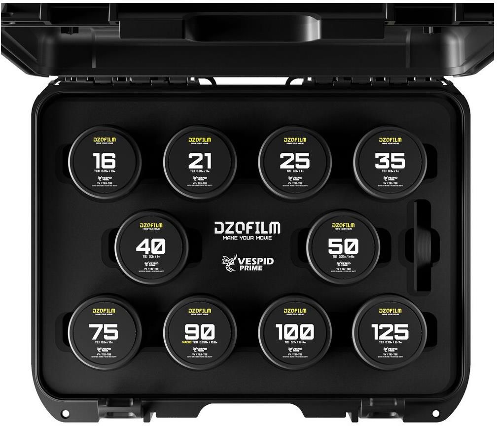 DZOFILM (DZO-V21K10PLM) Vespid Prime 10-lens Kit_PL/EF mount - Metric Zestaw 10 obiektywów DZOFilm VESPID Prime Cine nadaje się do użytku w produkcjach od niezależnych po studyjne. Zawarte w zestawie obiektywy 21, 25, 35, 40, 50, 75, 100 i 125 mm T2.1, 16 mm T2.8 i Macro 90 mm T2.8 PL pokrywają …