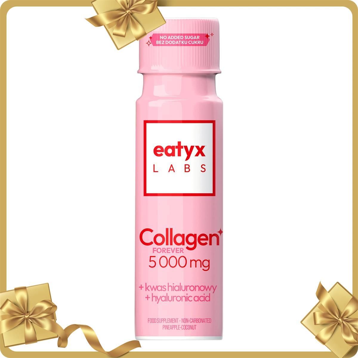 Poznaj eatyx LABS Collagen Forever – kolagen do picia o egzotycznym smaku ananasa i kokosa, który przeniesie Cię prosto do tropików. Każda butelka to 5000 mg hydrolizowanego kolagenu wołowego o cząsteczkach 2000 Da w duecie z kwasem hialuronowym, witaminą C, biotyną i cynkiem – składnikami, które realnie wspierają zdrowie i piękno skóry od środka. Kwas hialuronowy naturalnie występuje w skórze i odpowiada za jej nawilżenie, elastyczność i jędrność. To właśnie on wiąże wodę w tkankach, nadając cerze świeżość i młodzieńczy blask. Niestety z wiekiem jego poziom spada – dlatego regularna suplementacja jest ważna! Kolagen to główne białko strukturalne skóry – stanowi jej „rusztowanie”, które utrzymuje ją gładką, napiętą i odporną na upływ czasu. Z wiekiem jego naturalna produkcja także maleje, co prowadzi do utraty jędrności. Dostarcz go sobie w formie hydrolizatu o wysokiej przyswajalności od wewnątrz. Smak? Petarda!Słodko-egzotyczne połączenie ananasa i kokosa sprawia, że suplementacja przestaje być obowiązkiem, a staje się przyjemnością. To shot, który chce się pić – codziennie! Forma shota = maksimum wygody Mała butelka 80 ml zmieści się w każdej torebce czy plecaku. Nie musisz nic mieszać, odmierzać ani rozpuszczać – po prostu otwierasz, wypijasz i działasz. Dzięki shotom kolagenowym, łatwo zachować ciągłość suplementacji, która jest kluczem do realnych efektów. eatyx LABS Collagen Forever został dodatkowo wzbogacony o: witaminę C – wspiera produkcję kolagenu i chroni komórki przed stresem oksydacyjnym, biotynę – dla mocnych włosów i zdrowej skóry, cynk – dla pięknych włosów, skóry, paznokci, również chroni komórki przed stresem oksydacyjnym. To więcej niż kolagen z kwasem hialuronowym – to codzienny rytuał dla tych, którzy wierzą, że piękno zaczyna się od wewnątrz. Dlaczego wybrać eatyx LABS Collagen Forever? 5000 mg hydrolizatu kolagenu o cząsteczkach 2000 Da w jednej porcji. Kwas hialuronowy dla intensywnego nawilżenia. Kompleks witamin i minerałów dla skóry, włosów i paznokci. Rajski smak ananasa z kokosem. Forma shota, który ułatwia codzienną suplementację. Bez dodatku cukru, tylko 38 kcal, gotowy do wypicia zawsze i wszędzie. Zadbaj o siebie w rytmie dnia – po treningu, w biurze, w podróży.