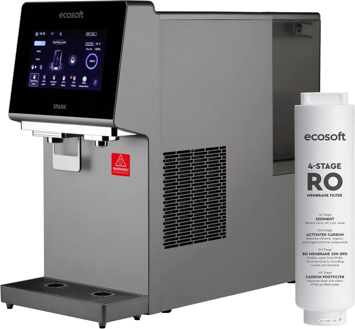 Nablatowy dyspenser wody gorącej, schłodzonej, pokojowej i gazowanej Ecosoft Spark. Wkład filtrujący 4w1.