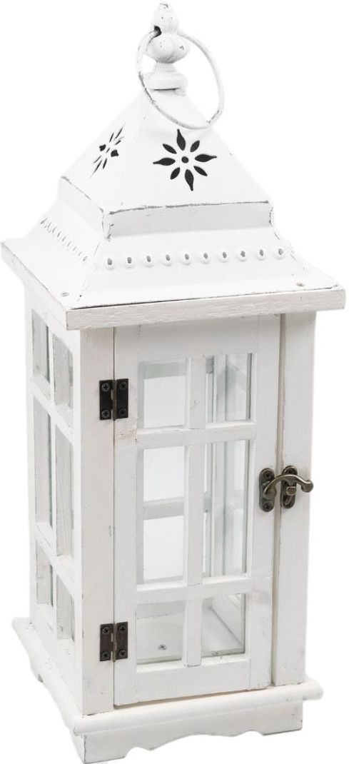 Dekoracyjny lampion ze szklanymi szybkami. Latarnia wykonana została z drewna koloru białego przecieranego w stylu retro. Górna część lampionu jest metalowa. Dopełnienia i uroku dodają latarni szklane szybki o grubości 3 mm. Wysokość lampionu 45 cm. We wnętrzu drewnianej konstrukcji umiejscowiona została metalowa podkładka o średnicy 5,5 cm, na którą można postawić świecę. Jedna ze ścian lampionu, dzięki zastosowaniu zawiasów otwiera się. Ozdobny, metalowy haczyk, umieszczony na latarni, pozwala nam swobodnie otwierać i zamykać drzwiczki. Idealnie sprawdzi się on zarówno w pomieszczeniach, jak i na balkonach, tarasach czy ogrodach. Lampion posiada praktyczny uchwyt wykonany z metalu, dzięki któremu można go łatwo przenieść. Modny i klimatyczny lampion będzie ozdobą która umili Ci każdy wieczór. Wzór: biały rozmiar M Produkt 1 x lampion Wymiary wysokość 45 cm szerokość 17 cm długość 17 cm Materiał drewno metal szkło Użytkowanie ozdoba wnętrza