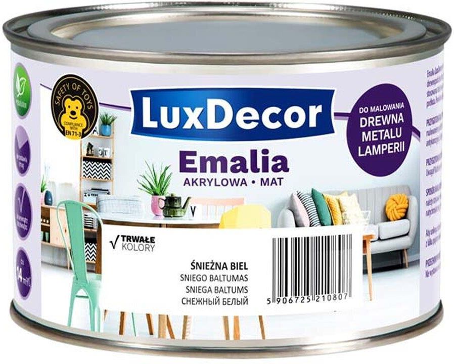 Wysoka wydajność i krycie Jedno opakowanie emalii może pokryć do 14 m² powierzchni (wydajność zależy od rodzaju i wykończenia podłoża, a także od używanych narzędzi), co czyni ją niezwykle ekonomiczną. Doskonałe krycie gwarantuje, że każda powierzchnia będzie wyglądać estetycznie i jednolicie. Ekologiczny wybór Produkt bezpieczny dla środowiska, z ograniczoną zawartością lotnych związków organicznych, co przyczynia się do lepszego stanu powietrza wewnątrz pomieszczeń. Trwałość i estetyka Dostępna w 20 kolorach oraz wariantach matowych i z połyskiem, emalia zapewnia głęboki i trwały kolor, który nie blaknie. Dodatkowo, jej formuła przeciwdziała smugom, zapewniając idealny wygląd na lata. Specyfikacja techniczna Skład: żywica akrylowa z dodatkami uszlachetniającymi i woskami Postać: wodna emulsja Kolory: dostępna w 20 kolorach oraz w wersji białej, zarówno w mat, jak i połysk Zapach: łagodny, specyficzny pH: 8,0-9,0 Gęstość: 1,1±0,1 g/cm³ Nanoszenie: pędzel lub wałek Czas schnięcia: dotykowe - 4 godziny, całkowite - 24 godziny Liczba warstw: 1-2 Mycie narzędzi: woda z detergentem Praktyczne porady dotyczące użycia Przygotowanie powierzchni Aby uzyskać najlepsze efekty, powierzchnia musi być czysta, sucha i gładka. Stare powłoki należy usunąć, a metalowe powierzchnie zagruntować odpowiednią farbą antykorozyjną. Aplikacja Przed malowaniem dokładnie wymieszaj emalię, aby zapewnić jednolity kolor. Aplikuj równomiernie, stosując dwie warstwy dla optymalnego krycia. Bezpieczeństwo Pomieszczenia, w których malujesz, powinny być dobrze wentylowane. Po użyciu, narzędzia umyj w ciepłej wodzie z detergentem. Wybierając emalię LUXDECOR, inwestujesz w produkt, który zapewni długotrwałą ochronę i estetykę malowanych powierzchni. Jej niezawodność i ekologiczny skład odpowiadają na potrzeby nawet najbardziej wymagających użytkowników, dbających o szczegóły wykonania i trwałość efektów swojej pracy. Nie czekaj, zadbaj o swoje wnętrza i powierzchnie zewnętrzne z LUXDECOR – emalią, która przynosi profesjonalne rezultaty każdemu, kto ceni sobie jakość i trwałość. Emalia Luxdecor Śnieżna Biel 0,40 l Mat Emalia akrylowa LUXDECOR to synonim nowoczesności w świecie farb! Dzięki swojej wszechstronności i wysokiej jakości, emalia ta stała się wyborem numer jeden dla wszystkich, którzy szukają niezawodnego rozwiązania do malowania różnorodnych powierzchni zarówno wewnątrz, jak i na zewnątrz pomieszczeń. Zalety naszej emalii akrylowej Wszechstronność zastosowania Idealna do drewna, metalu, betonu, gipsu oraz materiałów drewnopodobnych. Emalia LuxDecor sprawdzi się doskonale zarówno na zewnątrz, jak i wewnątrz pomieszczeń, oferując doskonałą odporność na zmienne warunki atmosferyczne.