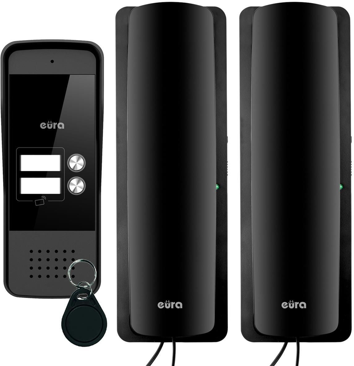 Solidna kaseta zewnętrzna przeznaczona jest do obsługi dwóch lokali. Wyposażona jest w dwa podświetlane przyciski wywołania oraz wizytowniki, umożliwiające umieszczenie nazwisk mieszkańców. Dodatkowo posiada wbudowany czytnik breloków zbliżeniowych (125 kHz UNIQUE) oraz wyjście 12V DC / 350 mA, przeznaczone do podłączenia elektrozaczepu i sterowania furtką (czas aktywacji 5 s). Obudowa wykonana ze stopu aluminium jest odporna na warunki atmosferyczne (IP65) i zabezpieczona daszkiem ochronnym. Kaseta może pracować w zakresie temperatur od -20°C do +50°C. Każdy z funkcjonalnych unifonów wyposażony jest w jedną melodię gongu oraz wyjście typu N.O. (max 1A / 24V DC, czas aktywacji 1 s). Do jednego z unifonów podłączany jest zasilacz, który zasila cały zestaw i zapewnia jego prawidłowe działanie. Kompaktowa i estetyczna obudowa oraz prosty montaż sprawiają, że unifony idealnie sprawdzają się w systemach domofonowych dla domów dwurodzinnych. Zestaw: - Napięcie zasilania: 12 V DC Pobór mocy - czuwanie / praca: <1.5W / <6.5W Ilość przewodów łączących: 8 Ilość obsługiwanych wyjść: 2 Kaseta zewnętrzna: - Ilość obsługiwanych wyjść: 1 Rodzaje wyjść: Wyjście 1: 12V DC 350 mA Czas aktywacji rygla: Wyjście 1: 5 sekund Maks.liczba lokatorów: 2 Materiał obudowy: Stop aluminium Czytnik breloków zbliżeniowych: Tak Maks. moc promieniowania: <5mW Częstotliwość pracy: 125kHz (UNIQUE) Sposób montażu kasety zewn.: Natynkowy Daszek ochronny: Tak Współczynnik ochrony: IP65 Temperaturowy zakres pracy kasety: -20°C ⁓ +50°C Dopuszczalna wilgotność względna: 10%...90% RH Wymiary kasety zewn. (W x SZ x G): 170 x 65 x 39 mm Waga netto kasety: 330g Unifon: - Ilość melodii gongu: 1 Ilość obsługiwanych wyjść: 1 Rodzaje wyjść: Wyjście 2: N.O. max 1A/24V DC Czas aktywacji rygla: Wyjście 2: 1 sekunda Stopień ochrony: IP20 Dopuszczalna wilgotność względna: 10%....90% RH Temperaturowy zakres pracy unifonu: -10ºC ~ +55ºC Wymiary unifonu (W x SZ x G): 210 x 67 x 56 mm Waga netto unifonu: 260 g Dwurodzinny domofon "Eura" ADP-26A3Zestaw wideodomofonowy Napięcie zasilania: 12 V DC Pobór mocy - czuwanie / praca: <1.5W / <6.5W Ilość przewodów łączących: 8 Ilość obsługiwanych wyjść: 2 Kaseta zewnętrzna Ilość obsługiwanych wyjść: 1 Rodzaje wyjść: Wyjście 1: 12V DC 350 mA Czas aktywacji rygla: Wyjście 1: 5 sekund Maks.liczba lokatorów: 2 Materiał obudowy: Stop aluminium Czytnik breloków zbliżeniowych: Tak Maks. moc promieniowania: <5mW Częstotliwość pracy: 125kHz (UNIQUE) Sposób montażu kasety zewn.: Natynkowy Daszek ochronny: Tak Współczynnik ochrony: IP65 Temperaturowy zakres pracy kasety: -20°C ⁓ +50°C Dopuszczalna wilgotność względna: 10%...90% RH Wymiary kasety zewn. (W x SZ x G): 170 x 65 x 39 mm Waga netto kasety: 330g Unifon Ilość melodii gongu: 1 Ilość obsługiwanych wyjść: 1 Rodzaje wyjść: Wyjście 2: N.O. max 1A/24V DC Czas aktywacji rygla: Wyjście 2: 1 sekunda Stopień ochrony: IP20 Dopuszczalna wilgotność względna: 10%....90% RH Temperaturowy zakres pracy unifonu: -10ºC ~ +55ºC Wymiary unifonu (W x SZ x G): 210 x 67 x 56 mm Waga netto unifonu: 260 g Funkcjonalny unifon i solidna kaseta Solidna kaseta zewnętrzna przeznaczona jest do obsługi dwóch lokali. Wyposażona jest w dwa podświetlane przyciski wywołania oraz wizytowniki, umożliwiające umieszczenie nazwisk mieszkańców. Dodatkowo posiada wbudowany czytnik breloków zbliżeniowych (125 kHz UNIQUE) oraz wyjście 12V DC / 350 mA, przeznaczone do podłączenia elektrozaczepu i sterowania furtką (czas aktywacji 5 s). Obudowa wykonana ze stopu aluminium jest odporna na warunki atmosferyczne (IP65) i zabezpieczona daszkiem ochronnym. Kaseta może pracować w zakresie temperatur od -20°C do +50°C. Każdy z funkcjonalnych unifonów wyposażony jest w jedną melodię gongu oraz wyjście typu N.O. (max 1A / 24V DC, czas aktywacji 1 s). Do jednego z unifonów podłączany jest zasilacz, który zasila cały zestaw i zapewnia jego prawidłowe działanie. Kompaktowa i estetyczna obudowa oraz prosty montaż sprawiają, że unifony idealnie sprawdzają się w systemach domofonowych dla domów dwurodzinnych.