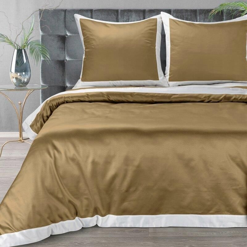 Elegancki złocisty komplet pościeli satynowej LAURA wyprodukowany przez firmę Eurofirany. Wykonano go z wysokiej jakości satyny bawełnianej z dodatkiem poliestru, dzięki czemu pościel jest bardziej wytrzymała, sprężysta i aksamitna w dotyku. Prezentowana kolekcja pościeli została zaprojektowana według najnowszych światowych trendów. Kupując ją możesz więc być pewien, że wystrój Twojej sypialni będzie modny i elegancki. Złocisty komplet pościel, ozdobiony białą kantą na poduszkach i poszwie, prezentuje się niezwykle efektownie, a kontrastowa kanta przełamuje jednobarwną monotonię i nadaje całości wyjątkowego luksusowego charakteru. W skład kompletu wchodzą: poszwa na kołdrę: 160 x 200 cm - 1 szt. poszewki na poduszki: 70 x 80 cm - 2 szt. Producent: Eurofirany Rozmiar poszwy na kołdrę: 160x200 cm Skład surowcowy: 100% satyna bawełna Sposób zapięcia: zamek błyskawiczny Kolor: złocisty, biały Gramatura: 125 GSM Skład: 55% bawełna, 45% poliester