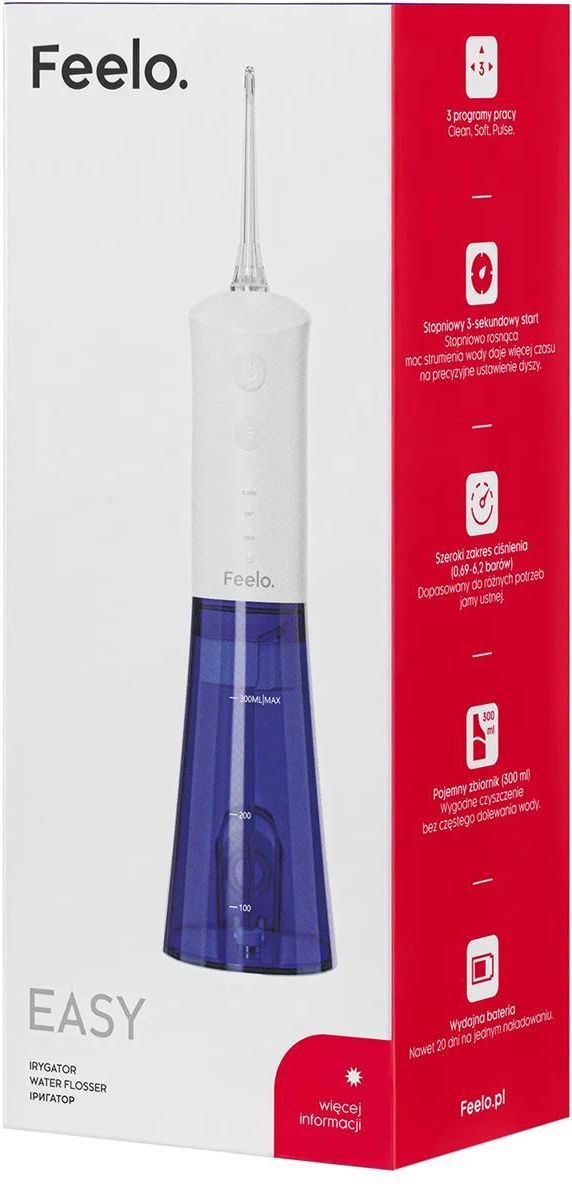 FEELO EASY Irygator bezprzewodowy, 3 programy, poj. 300 ml, 2 końcówki Dlaczego warto wybrać irygator Feelo Easy? 1. Skutecznie usuwa resztki jedzenia i płytkę bakteryjną z trudno dostępnych miejsc. 2. Poprawia zdrowie dziąseł i ogranicza stany zapalne. 3. Pomaga walczyć z nieświeżym oddechem. 4. Prosty w obsłudze, poręczny, lekki i bezprzewodowy. To jedno urządzenie, które realnie poprawi stan Twojej jamy ustnej – w domu, w pracy, w podróży. Regularne stosowanie irygatora Feelo Easy: zmniejsza ryzyko próchnicy ukrytej, zwłaszcza między zębami, poprawia stan i ukrwienie dziąseł, eliminuje bakterie odpowiedzialne za przykry zapach z ust, wspomaga higienę u osób z aparatem, mostem lub implantami. Najważniejsze funkcje Feelo Easy: 3 programy pracy: Clean, Soft i Pulse; Zakres ciśnienia 0,69–6,2 barów – od delikatnego po intensywne czyszczenie.; Bateria 1400 mAh – nawet 30 dni pracy na jednym ładowaniu.; Timer 2 minuty – automatyczne zakończenie irygacji po zalecanym czasie.; Stopniowy start – przez 3 sekundy ciśnienie łagodnie rośnie, co ułatwia precyzyjne ustawienie dyszy.; Zbiornik 300 ml – zapewnia wygodną irygację bez konieczności dolewania wody.; Ergonomiczny uchwyt – lekki, dobrze leży w dłoni i nie ślizga się podczas używania. 3 tryby pracy dostosowane do różnych potrzeb: 1. Clean - optymalny tryb do codziennej irygacji, skutecznie usuwa resztki jedzenia i płytkę bakteryjną z trudno dostępnych miejsc. 2. Soft - delikatny tryb dla osób z wrażliwymi dziąsłami, kieszonkami dziąsłowymi. 3. Pulse - tryb pulsacyjny łączący czyszczenie z masażem dziąseł, poprawia ukrwienie, idealny dla osób z problemami z dziąsłami. ładowania nawet przez miesiąc Nie musisz pamiętać o codziennym podłączaniu irygatora do ładowarki. Wbudowana bateria litowo-jonowa pozwala na korzystanie z Feelo Easy nawet przez 30 dni (przy używaniu dwa razy dziennie w trybie Soft). To ogromny komfort – zwłaszcza w podróży. Skład zestawu: 1 irygator, 1 zbiornik na wodę (300 ml), 2 końcówki standardowe, 1 kabel ładujący USB - DC V5